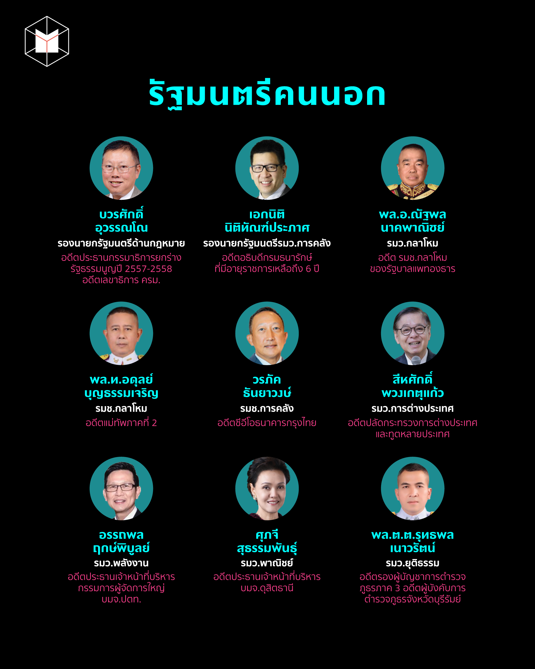 ถึงกระนั้น สิ่งที่ประชาชนได้เห็นจากคณะรัฐมนตรีชุดนี้ คงหนีไม่พ้นรายชื่อรัฐมนตรี ‘คนนอก’ ซึ่งถูกเทียบเชิญโดยอนุทิน เพราะต้องการคนที่มีความรู้ความสามารถในวิชาชีพของกระทรวงนั้นๆ เข้ามาทำงาน โดยแต่ละคนมีประวัติการทำงานดังนี้