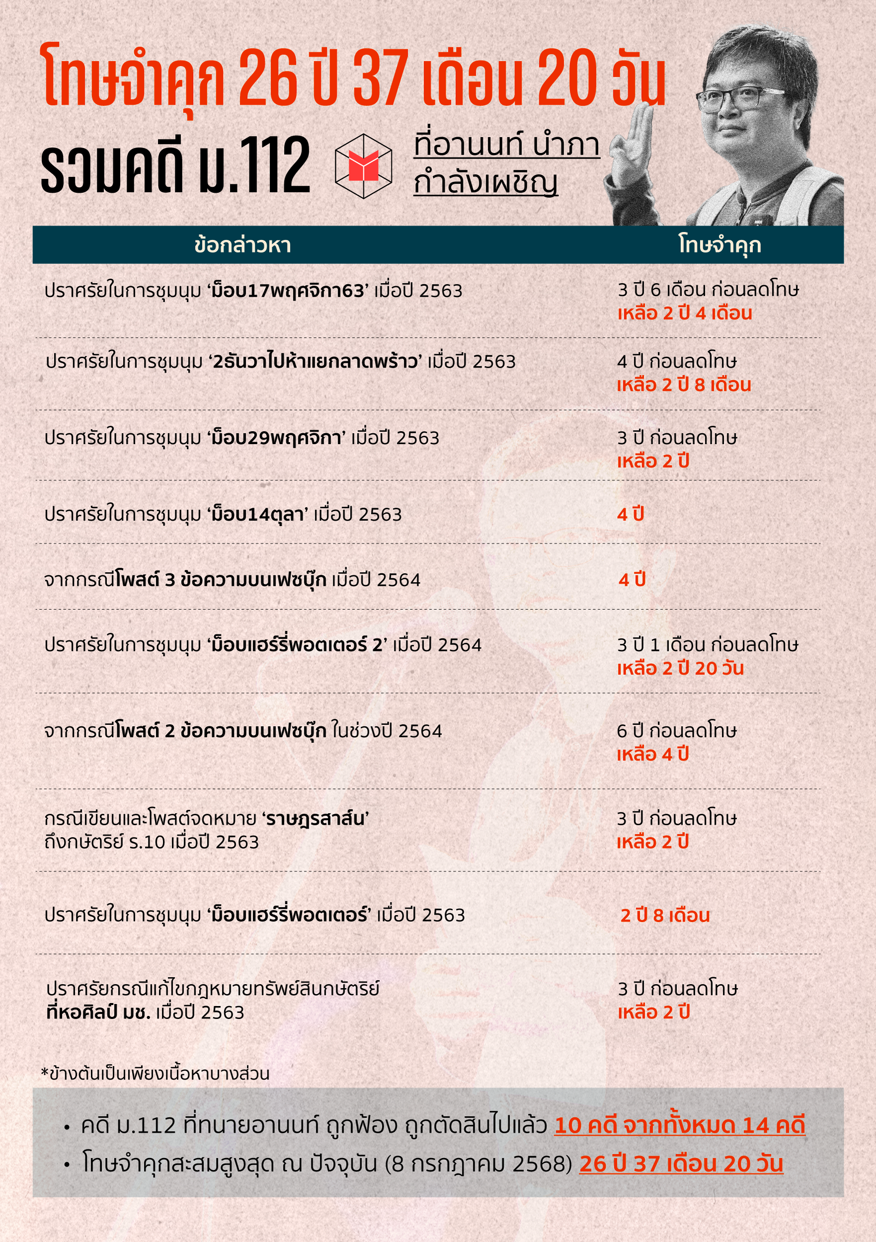 คดี ม.112 ของอานนท์ ถูกตัดสินไปแล้ว 10 คดี จากทั้งหมด 14 คดี