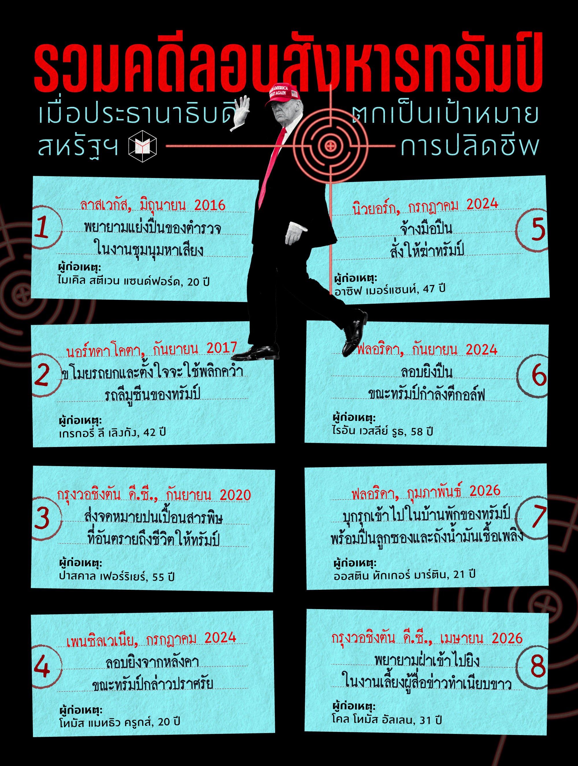 แม้ตอนนี้คดีดังกล่าวจะยังไม่เป็นที่สิ้นสุด แต่เหตุการณ์นี้ก็จุดประกายความสนใจให้กับประเด็น ‘การลอบสังหารทรัมป์’ เพราะนี่ไม่ใช่ครั้งแรกที่ประธานาธิบดีสหรัฐฯ คนนี้ตกเป็นเป้าสังหารของผู้ก่อเหตุ