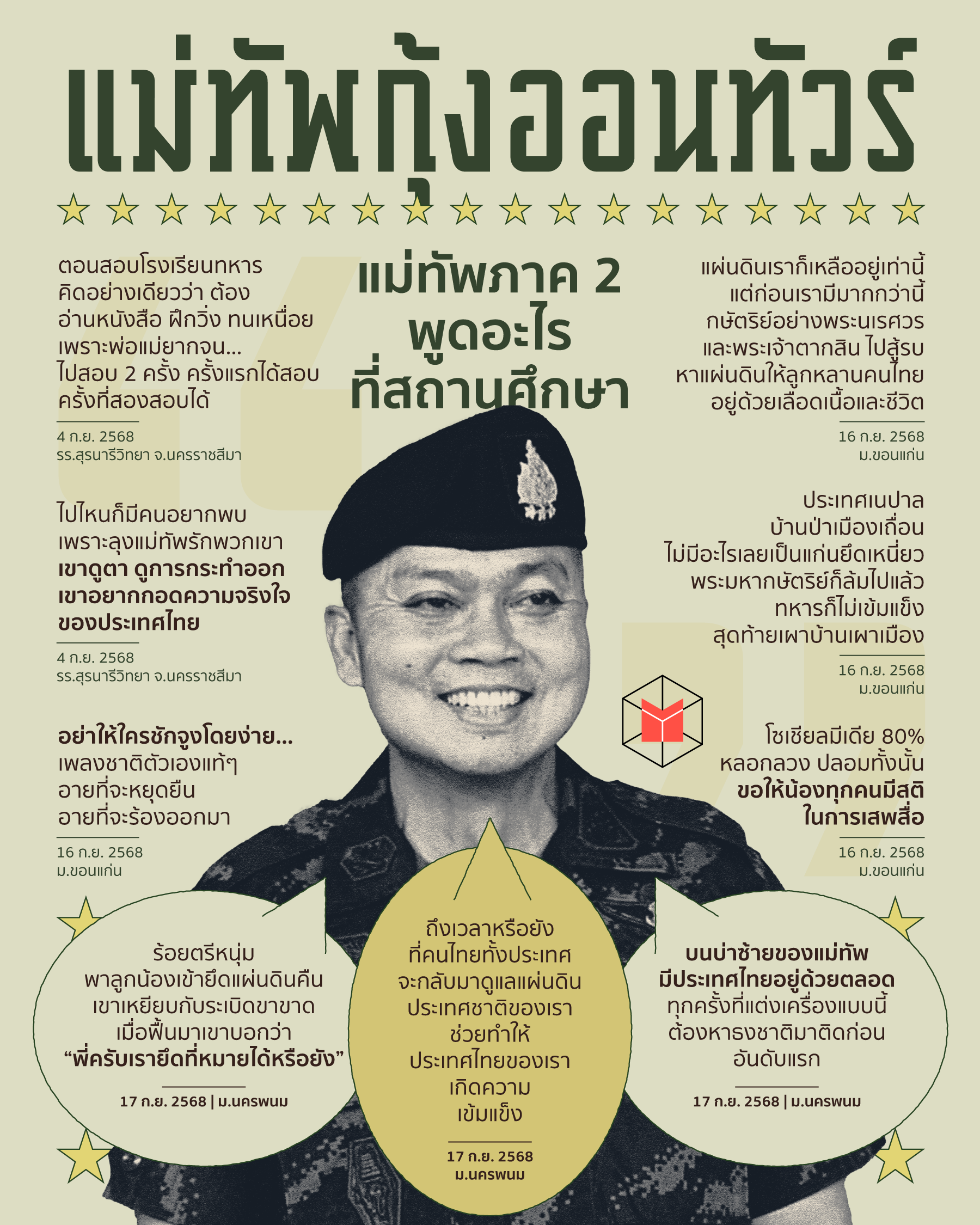 “แม้แต่การที่แม่ทัพมาพูดวันนี้ก็อย่าพึ่งเชื่อ ลองทบทวนว่าใช่หรือไม่ ลองกลับไปถามพ่อแม่ว่าที่แม่ทัพพูดนั้น เห็นด้วยหรือคิดอย่างไร พวกเธออต้องเป็นผู้ใหญ่ในวันข้างหน้า เมื่ออายุครบพวกเธอจะไปเลือกตั้งได้ เราต้องช่วยหกันเปลี่ยนแปลงประเทศไปทางที่ดี” (4 ก.ย. 2568 รร.สุรนารีวิทยา จ.นครราชสีมา)