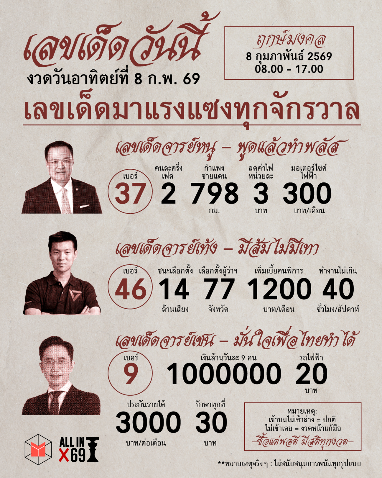 ปิดท้ายกันด้วยเลขเด็ดจารย์เชน ที่ครั้งนี้มาพร้อมสโลแกน “เพื่อไทยทำได้” และความมั่นใจทำได้เพราะพรรคมีประสบการณ์ทำงานมาแล้ว อยู่ได้ทุกโพยกับเบอร์ 9 แถมอดีตเคยแรงกวาดคะแนนเสียงไปได้ถึง 10 ล้านเสียงจากการเลือกตั้งเมื่อปี 66 โดยนโยบายที่พูดเมื่อไหร่คนไทยก็ยิ้มกับ 30 บาทรักษาทุกโรคที่จะมาในเวอร์ชันใหม่