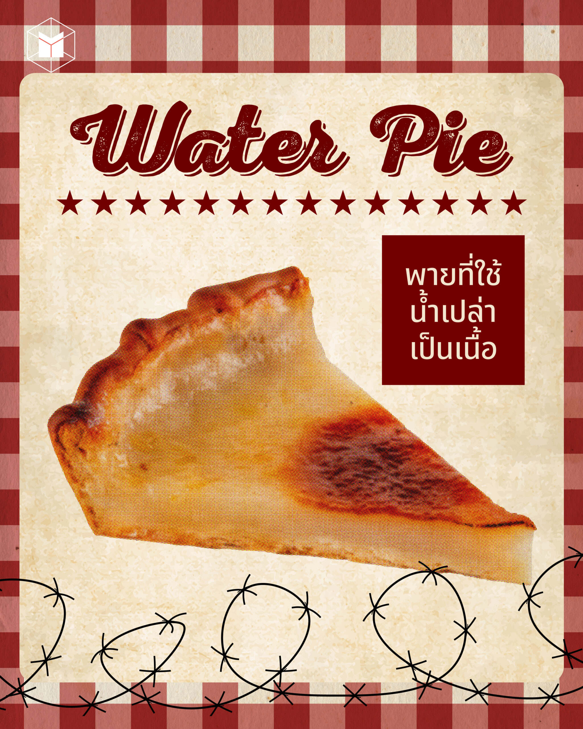 หนึ่งในพายที่ฟังดูสุดโต่งและมหัศจรรย์มากคือพายน้ำ – Water Pie ซึ่งพายน้ำนี้ก็เป็นไปตามชื่อ ปกติเราจะทำพายจากไส้ หรือฟิลลิ่งต่างๆ เนื้อสัตว์ ผลไม้ สตูว์ ไส้พายมักเป็นคัสตาร์ดได้ด้วยไข่ แต่พายน้ำคือการกรุแป้งพายแบบปกติ แล้วใช้น้ำเปล่า น้ำตาล วางเนยเป็นชิ้นๆ โรยด้วยแป้งก่อนจะเข้าอบ
