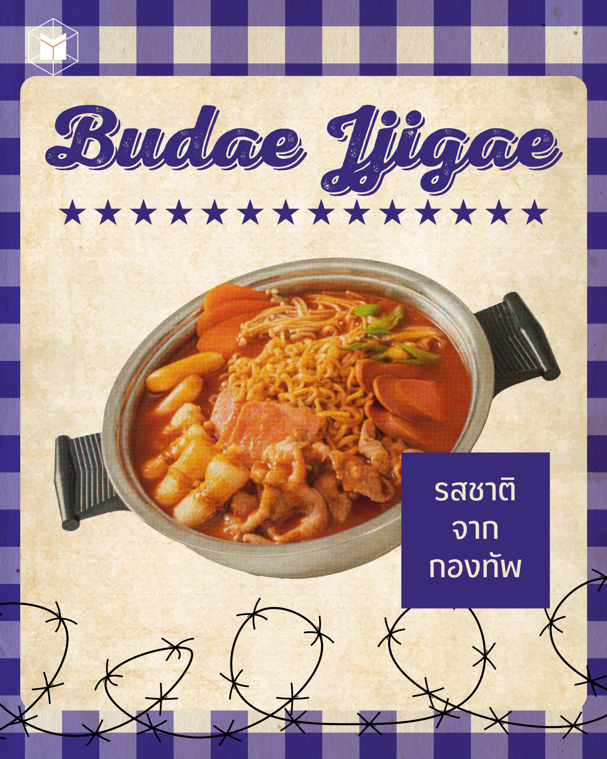 บูเดจิเก เป็นเมนูที่เราคนไทยน่าจะคุ้นเคยจากร้านอาหารและวัฒนธรรมเกาหลีที่ใกล้ตัว ซึ่งเมนูซุป- สตูว์แบบเกาหลี ที่มักเป็นน้ำแดงๆ รสจัดจ้าน และมักใส่วัตถุดิบหลากหลาย แต่ที่สำคัญมักจะต้องมีของกระป๋อง เช่น สแปมและถั่วกระป๋องในซอสสีแดงๆ ผสมกับวัตถุดิบแบบเกาหลีโดยเฉพาะกิมจิ โคชูจัง เต้าหู้ ส่วนผสมสองโลก เมื่อผสมกันกลายเป็นรสกลมกล่ม เป็นอีกหนึ่งตัวตนของรสชาติแบบเกาหลีที่ร่วมสมัย