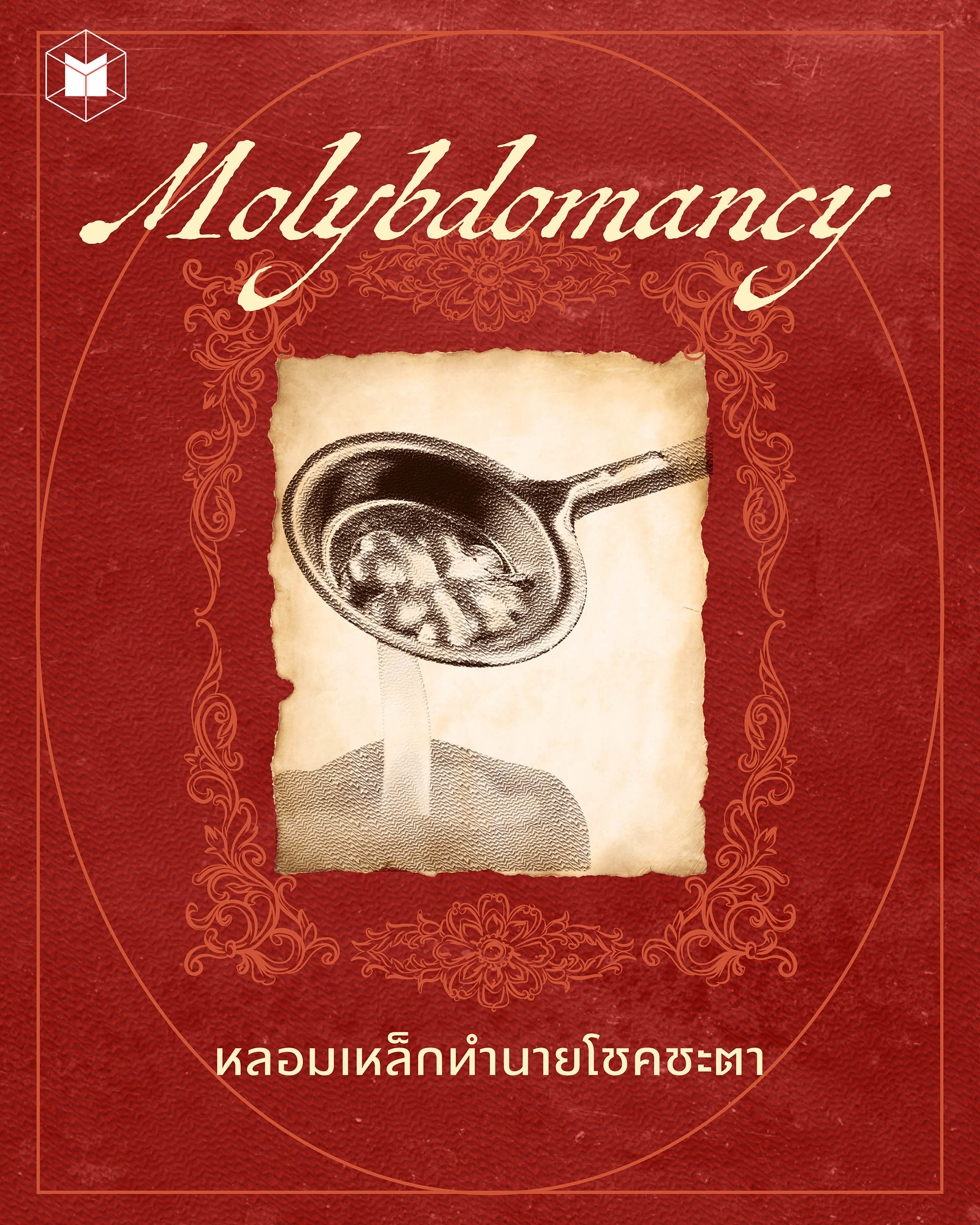 ก่อนหน้าเราได้ชวนทุกคนไปสังเกตรูปร่างของกากชาและกาแฟกันไปแล้ว คราวนี้เราลองมามองอนาคตผ่านรูปร่างของตะกั่วหลอมเหลวกันบ้าง กับ ‘Molybdomancy’ คือการทำนายดวงชะตา ด้วยนำตะกั่วหรือดีบุกที่หลอมเหลวจากความร้อนเทลงไปในน้ำเพื่อให้มันแข็งตัว โดยรูปทรงที่ได้จะถูกนำไปตีความในเรื่องของลางบอกเหตุเป็นหลัก แต่ในบางธรรมเดียวอาจนำชิ้นโลหะที่ได้ไปส่องกับแสงเทียน แล้วจึงอ่านความหมายจากเงาที่เกิดขึ้นแทน