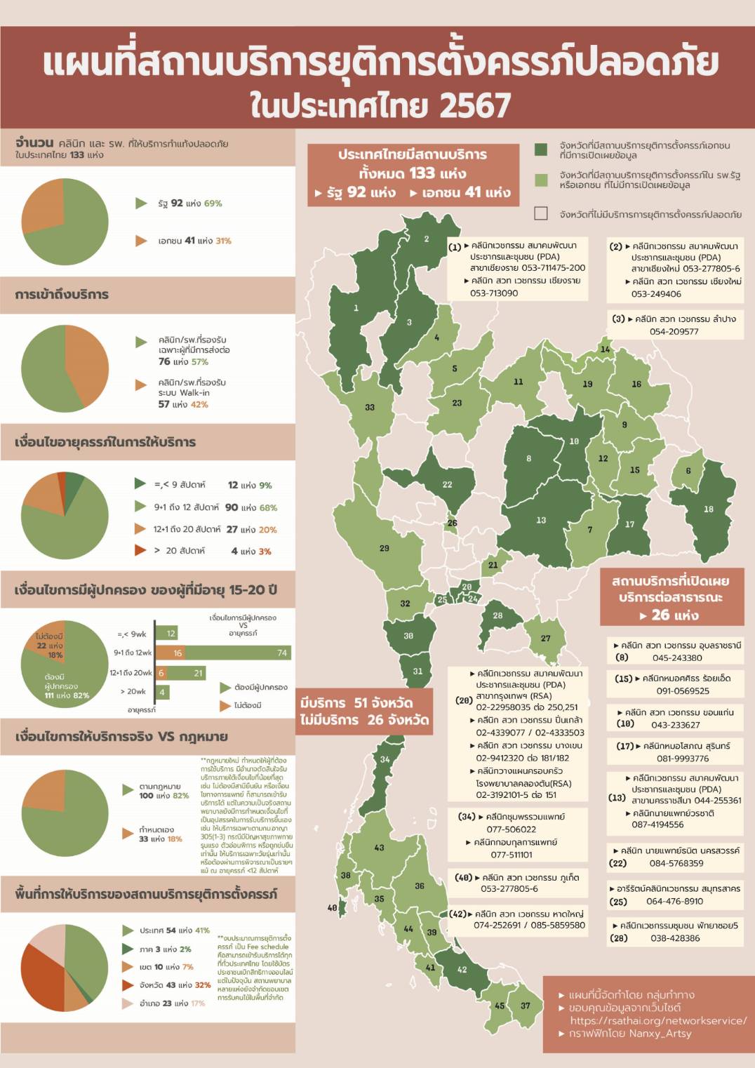 ณัฐนันท์ เจ้าหน้าที่ให้คำปรึกษามูลนิธิทำทาง กล่าวว่า “ตอนนี้ประเทศไทยมีสถานพยาบาลที่ให้บริการยุติการตั้งครรภ์อยู่ราว 156 แห่งทั่วประเทศ รวมทั้งของรัฐและเอกชน แต่กระจุกตัวอยู่เพียง 55 จังหวัด อีก 22 จังหวัดยังไม่มีบริการเลย เช่น น่าน ลำพูน เพชรบุรี ชัยนาท พิจิตร นนทบุรี อยุธยา อ่างทอง สระบุรี ฉะเชิงเทรา ปราจีนบุรี สระแก้ว ศรีสะเกษ พังงา”
