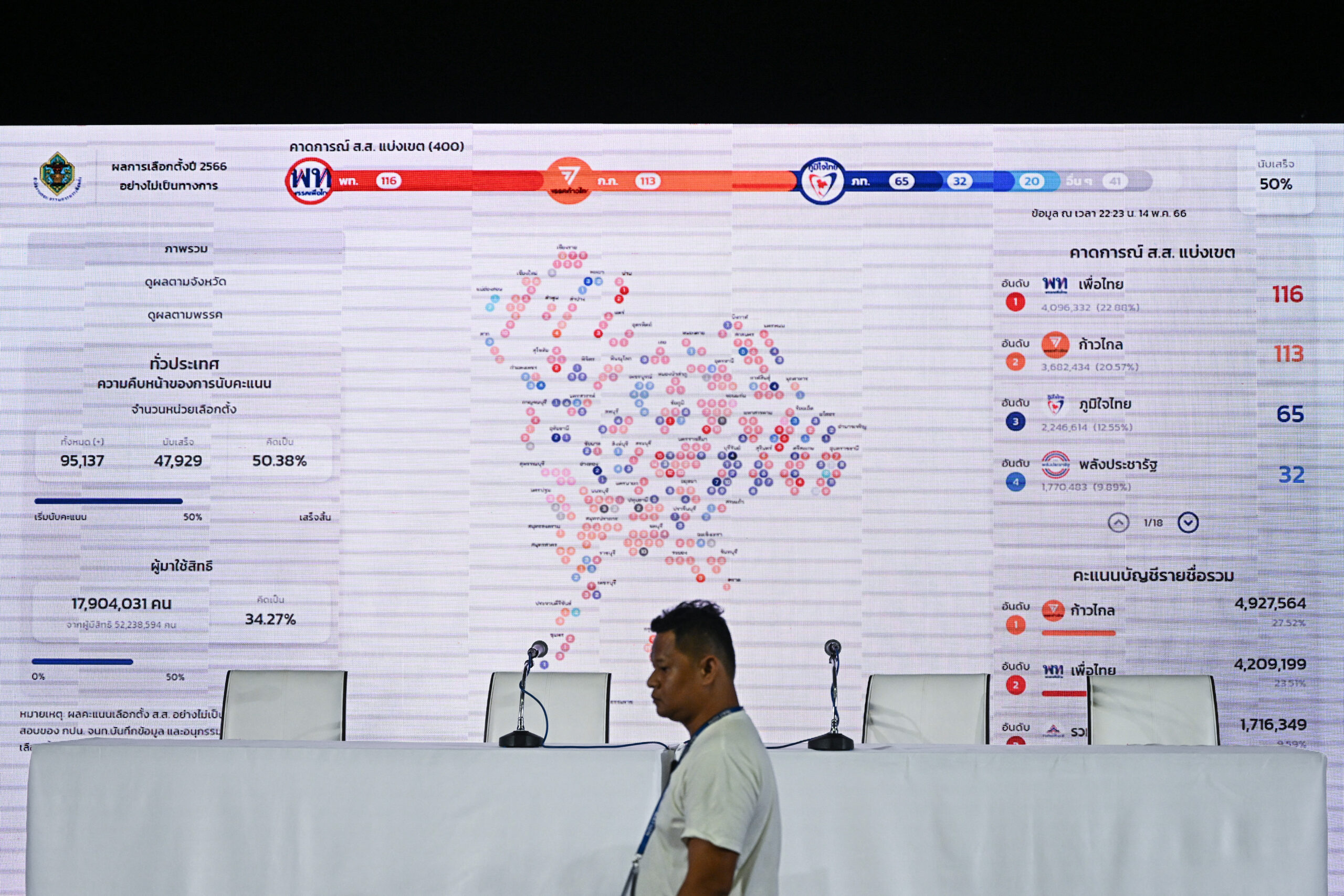บรรยากาศการนับคะแนนการเลือกตั้ง ที่สำนักงานใหญ่พรรคเพื่อไทย เมื่อวันที่ 14 พฤษภาคม 2566 (Photo by MANAN VATSYAYANA / AFP)