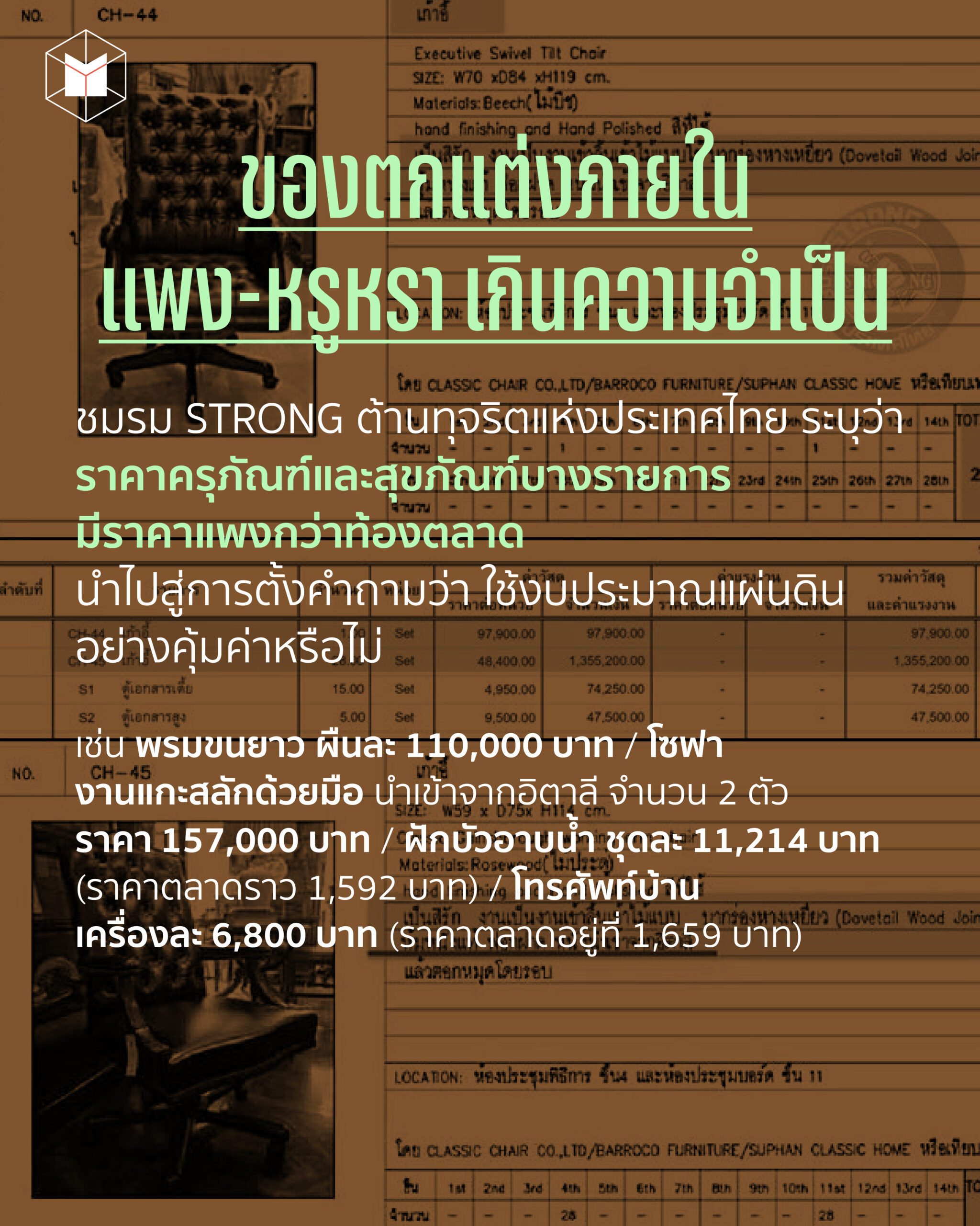 ชมรม STRONG ต้านทุจริตแห่งประเทศไทย ได้เปิดเผยราคาเฟอร์นิเจอร์และสิ่งของตกแต่งภายในตึก สตง.แห่งใหม่ ที่หลายรายการถูกมองว่า แพงและหรูหราจนเกินไป ซึ่งมีราคารวมกันกว่า 139 ล้านบาท เช่น ฝักบัวอาบน้ำ ชุดละ 11,214 บาท จัดซื้อทั้งหมด 44 ชุด รวมมูลค่ากว่า 493,416 บาท หรือ งบสำหรับสุขภัณฑ์ของผู้บริหารตึก สตง.ที่ใช้งบประมาณกว่า 4.1 ล้านบาท