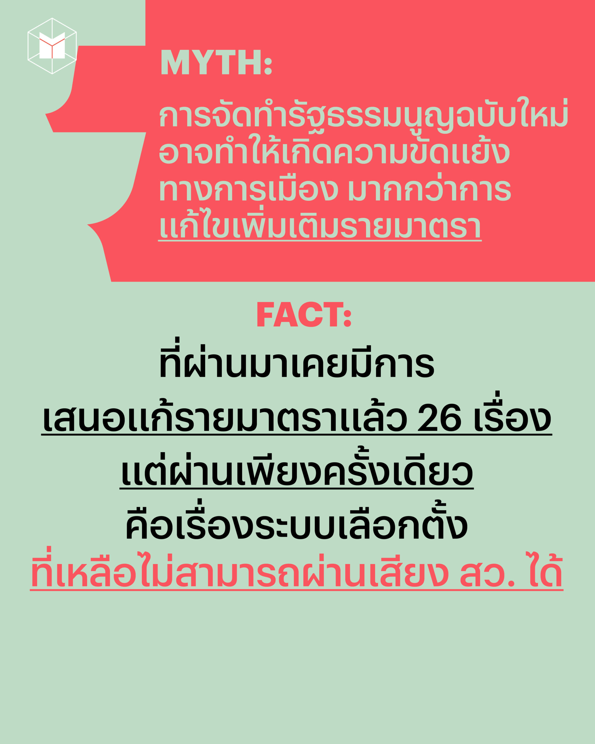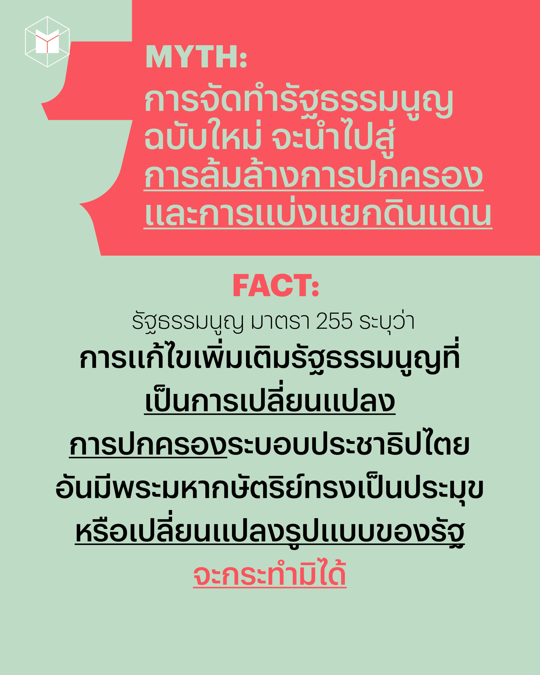 ก็ต้องย้อนกลับไปที่ Myth ก่อนหน้านี้ว่า หากมีการแก้ไขหมวด 2 พระมหากษัตริย์ จำเป็นต้องทำประชามติก่อน โดยประชาชนอย่างพวกเราก็จะมีสิทธิออกเสียงว่าเห็นชอบหรือไม่เห็นชอบให้มีการแก้ไขกฎหมายดังกล่าว