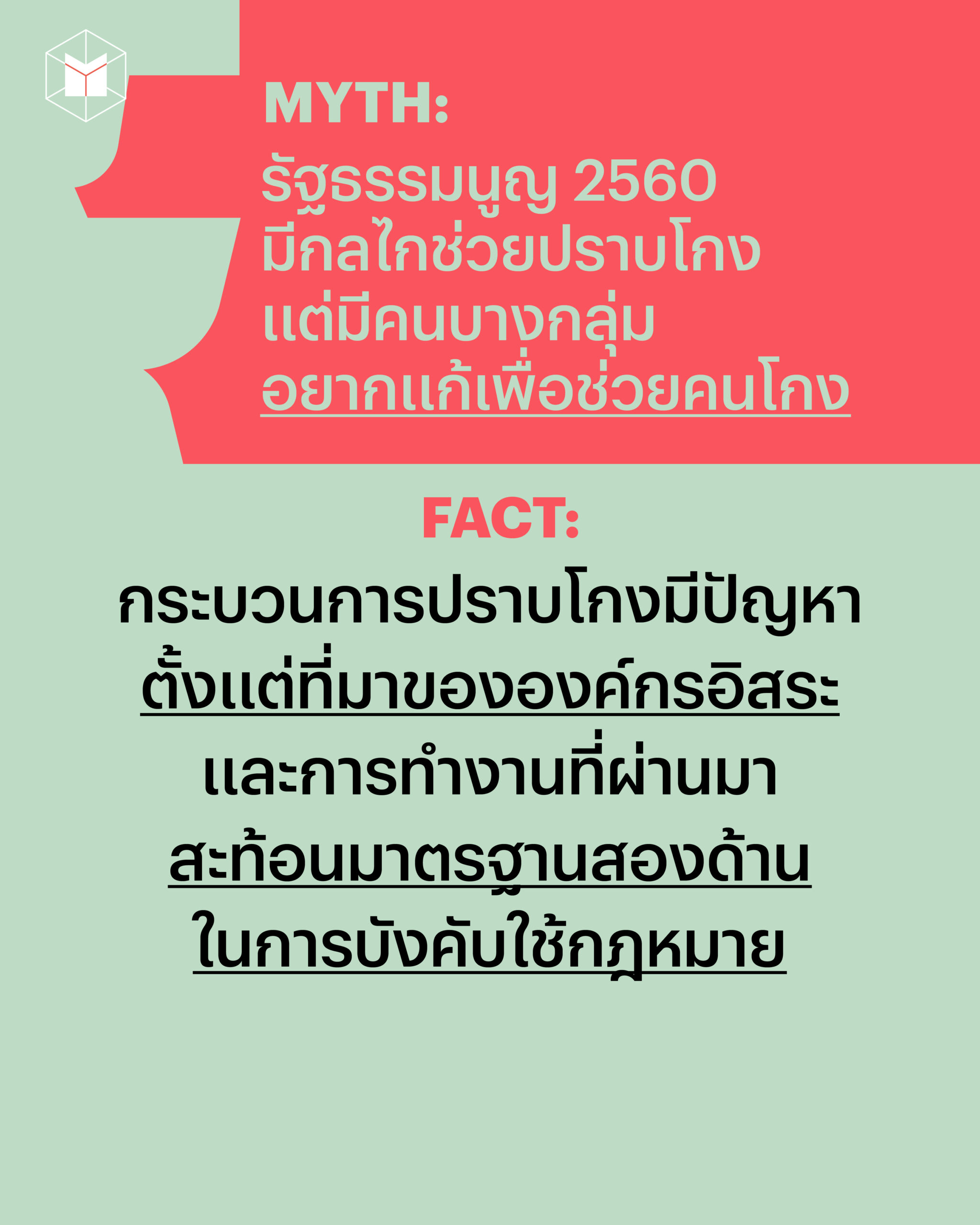 Myth ที่ 5 รัฐธรรมนูญ 2560 มีกลไกช่วยปราบโกง แต่มีคนบางกลุ่มอยากแก้เพื่อช่วยคนโกง และคนได้ประโยชน์คือนักการเมืองไม่ใช่ประชาชน