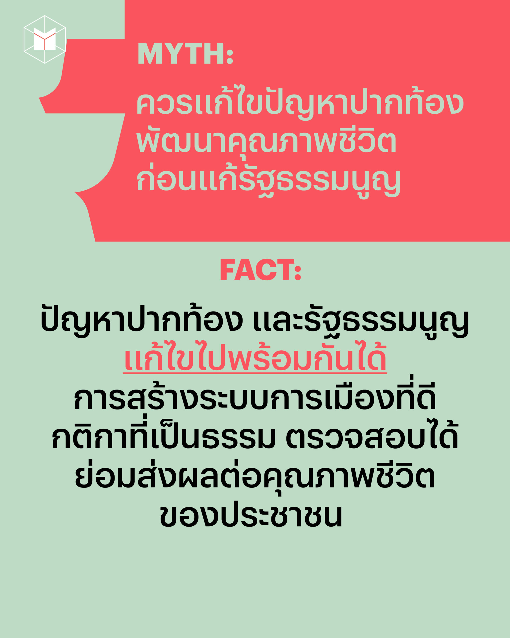 Myth สุดท้าย เป็นประโยคที่เรามักเห็นกันจนคุ้นตา ทุกครั้งที่มีการเสนอประเด็นปรับเปลี่ยนโครงสร้างสังคมก็จะมีคำพูดว่า “ควรแก้ไขปัญหาปากท้อง หรือพัฒนาคุณภาพชีวิตคนในประเทศก่อน” การจัดทำรัฐธรรมนูญใหม่ครั้งนี้ก็เช่นกัน