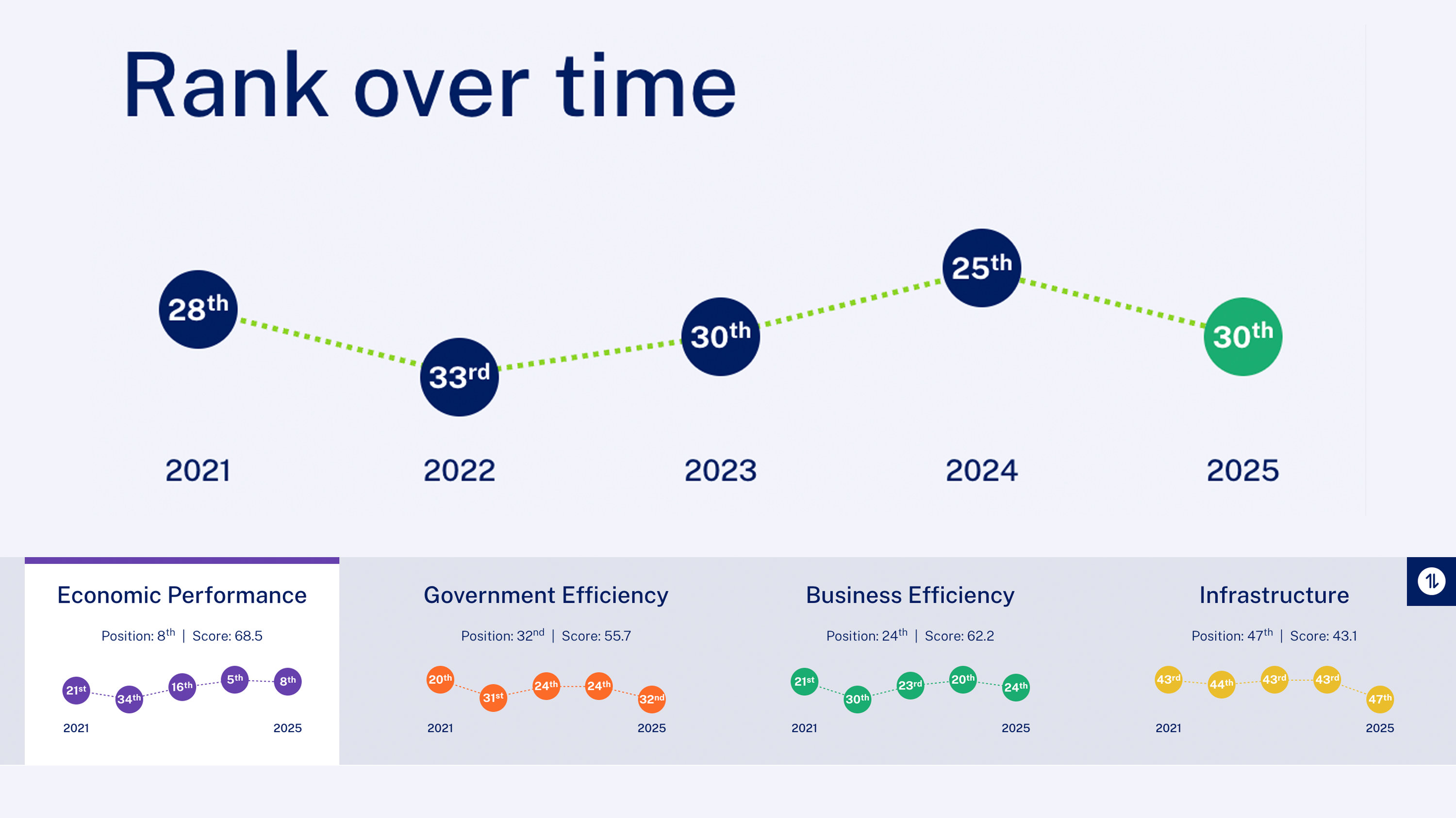 ขณะเดียวกัน ความสามารถในการแข่งขันของประเทศไทยก็กำลังลดลงไปด้วย จากรายงานของ IMD ในปี 2568 พบว่าประเทศไทยอยู่ในลำดับที่ 30 (ลดลง 5 อันดับ จากปี 2567) โดยมีอันดับลดลงทุกด้าน ไม่ว่าจะเป็นสมรรถนะทางเศรษฐกิจ ประสิทธิภาพของภาครัฐ ประสิทธิภาพของภาคธุรกิจ หรือโครงสร้างพื้นฐาน