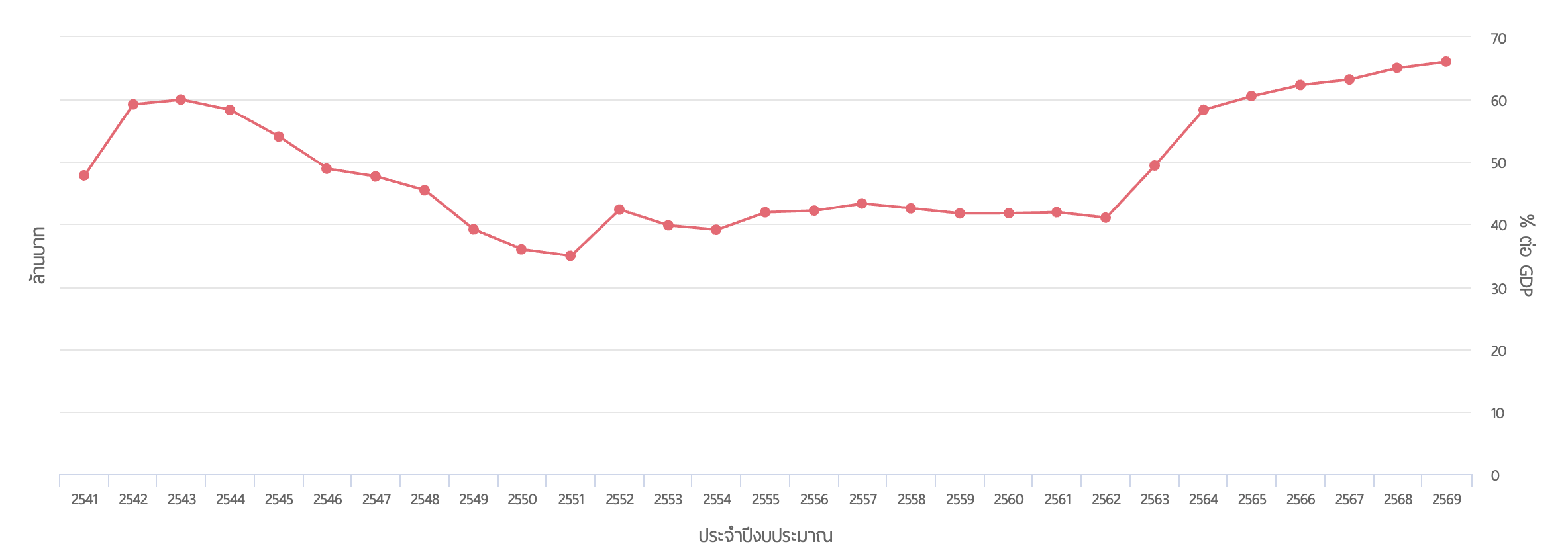 ภาพ แผนภูมิหนี้สาธารณะต่อ GDP ปีงบประมาณ 2541-2569 (cr. สำนักงานบริหารหนี้สาธารณะ)