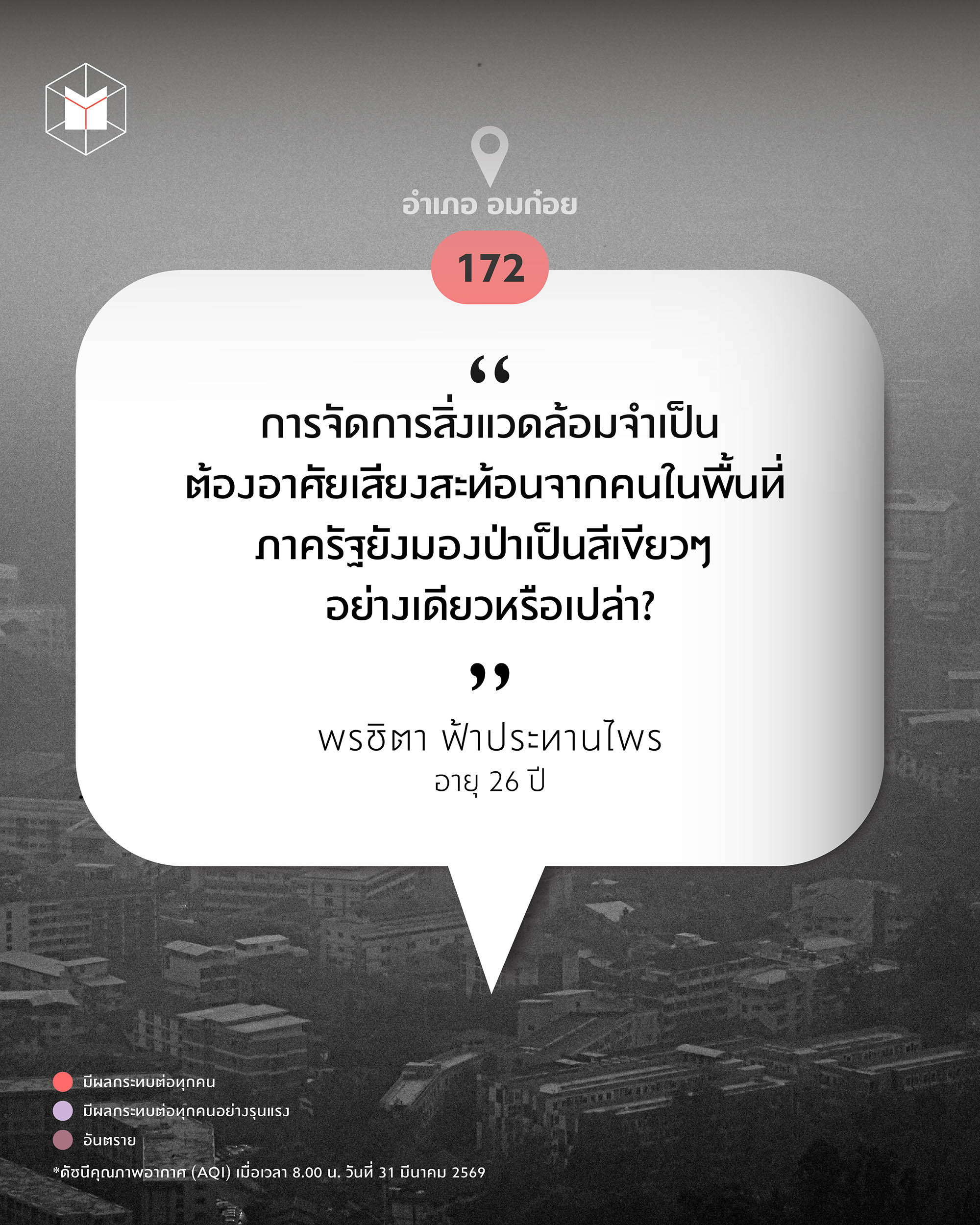 ดวง หนึ่งในประชาชนในพื้นที่ เล่าว่า หลายปีก่อนอำเภออมก๋อยก็มีการเผาทุกปี ชุมชนอยู่กับการใช้ไฟในป่ามานานโดยไม่กระทบหนักเช่นนี้ แต่เมื่อปัญหาถูกพูดถึงมากขึ้น รัฐจึงออกมาตรการควบคุมการเผาอย่างเข้มงวด ซึ่งส่งผลให้คนในพื้นที่ โดยเฉพาะชุมชนบนดอย กลายเป็นกลุ่มที่ถูกจับตามองและมักถูกมองว่าเป็นต้นเหตุ ทั้งที่การใช้ไฟเพื่อจัดการทรัพยากรเป็นภูมิปัญญาที่ปฏิบัติกันมาอย่างยาวนาน ป่าไม้บางประเภท ก็จำเป็นต้อง ‘ชิงเผา’ เพื่อลดปริมาณเชื้อเพลิง ลดความเสี่ยงและความรุนแรงของไฟป่าใหญ่ที่อาจเกิดขึ้นภายหลัง เพราะฉะนั้น การออกมาตรการห้ามเผา จึงเป็นวิธีการเหมารวมความหลากหลายของระบบนิเวศเกินไป