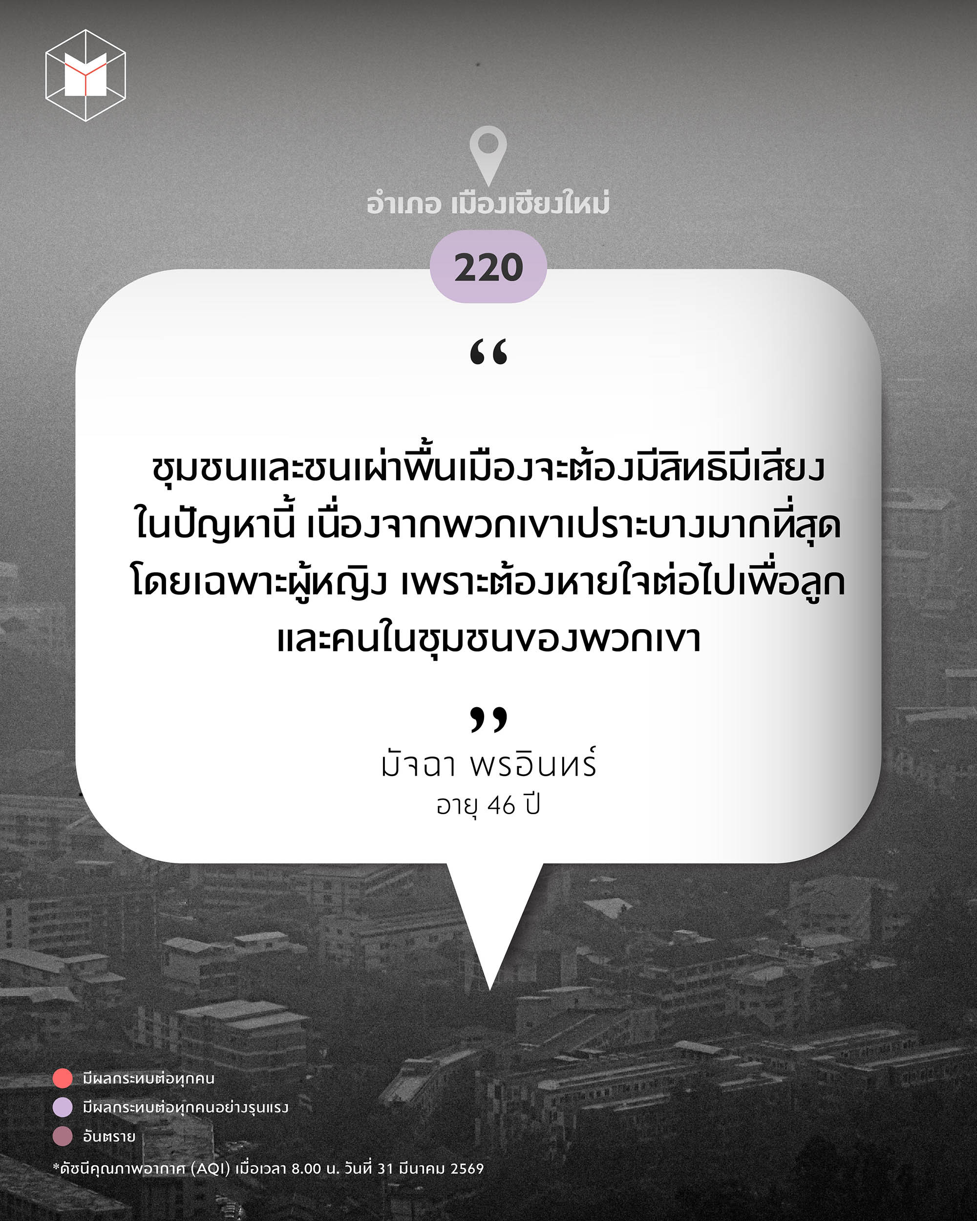 แน่นอนว่าคนเมืองยังมีทางเลือกป้องกันตนเองได้ แต่กลุ่มชนเผ่าพื้นเมือง โดยเฉพาะผู้หญิง ผู้สูงอายุ ผู้พิการ และเด็ก ต้องอาศัยอยู่ในบ้านเปิดโล่ง หลายคนต้องพึ่งถังออกซิเจน แต่ก็เข้าถึงบริการสาธารณสุขได้ยาก แม้แต่เธอเองก็ได้รับผลกระทบทางสุขภาพ ต้องเข้าโรงพยาบาล และลูกของเธอก็เจ็บป่วยจากปัญหานี้เช่นกัน ถึงอย่างนั้น ข้อมูลปัญหาที่เกิดขึ้นกลับไม่เคยถูกจัดเก็บอย่างเป็นระบบ ลมหายใจของชนเผ่าพื้นเมืองยังถูกมองข้ามในปัญหาฝุ่นควันที่เกิดขึ้น