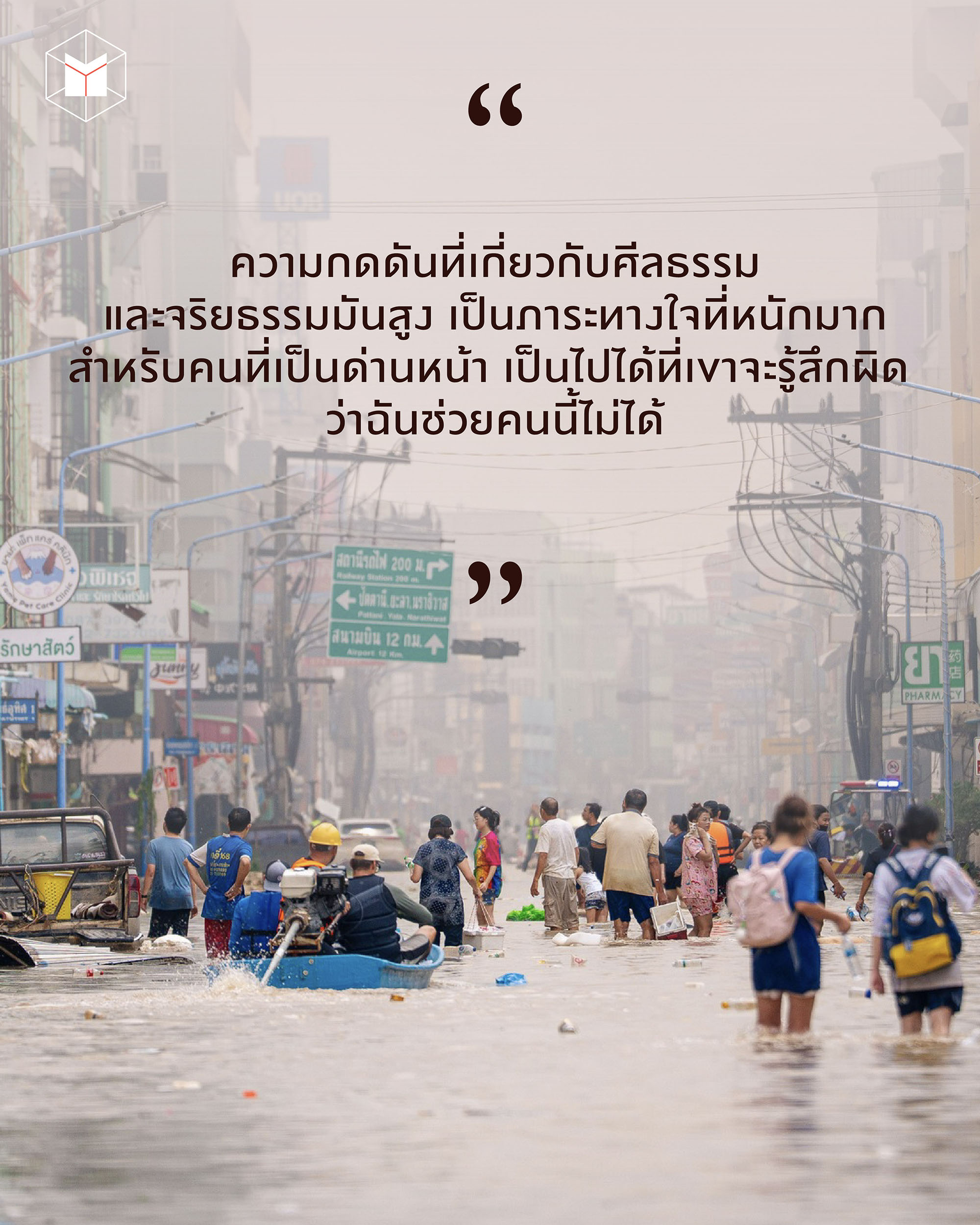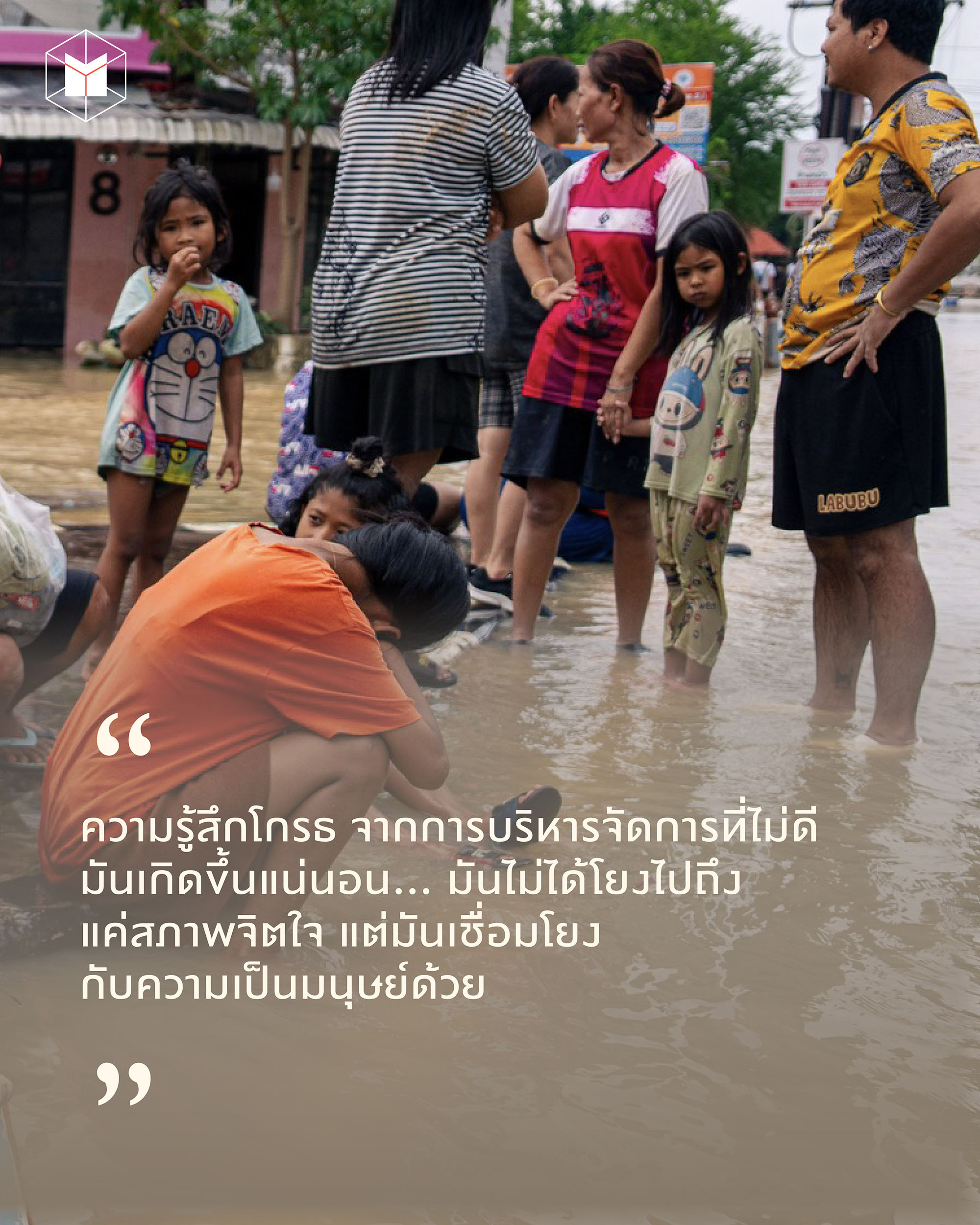 “ความรู้สึกโกรธ จากการบริหารจัดการที่ไม่ดีมันเกิดขึ้นแน่นอน ไม่ว่าจะเป็นรัฐบาล องค์กรส่วนท้องถิ่น หรือแม้กระทั่งตัวกู้ภัยและเจ้าหน้าที่ศูนย์อพยพ พออยู่ในสถานการณ์วิกฤติ สิ่งหนึ่งที่เป็นพื้นฐานของมนุษย์มากๆ เลย คือความปลอดภัย เมื่อชีวิตไม่ปลอดภัย มันก็ก่อให้เกิดความเครียด ความโกรธ หรือความไม่พอใจ มันไม่ได้โยงไปถึงแค่สภาพจิตใจเท่านั้น แต่มันเชื่อมโยงกับความเป็นมนุษย์ด้วย”