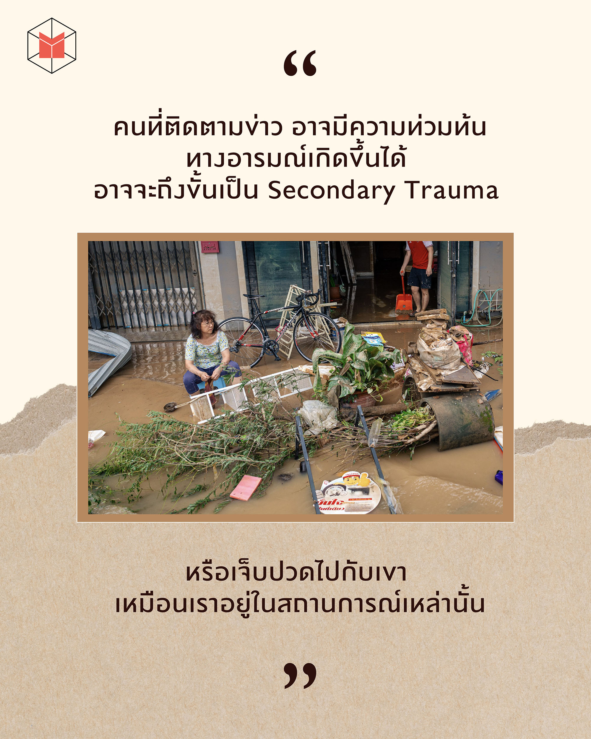 ภัยพิบัติใหญ่ไม่ได้ส่งผลต่อผู้ประสบภัยหรือเจ้าหน้าที่เท่านั้น แต่สำหรับคนทางบ้านที่ติดตามข่าวอย่างใกล้ชิด ก็รู้สึกแย่ไม่ต่างกัน เราอาจรู้สึกสะเทือนใจทุกครั้งที่เห็นภาพคนรอการช่วยเหลือ กังวลใจทุกนาทีที่ติดต่อคนในครอบครัวไม่ได้ วิกกี้ชี้ว่าความท่วมท้นจากการรับรู้ข่าวนี้ซ้ำๆ แม้เราจะไม่ได้ประสบเอง แต่ก็ส่งผลต่อจิตใจไม่ต่างจากผู้ประสบภัยเลย