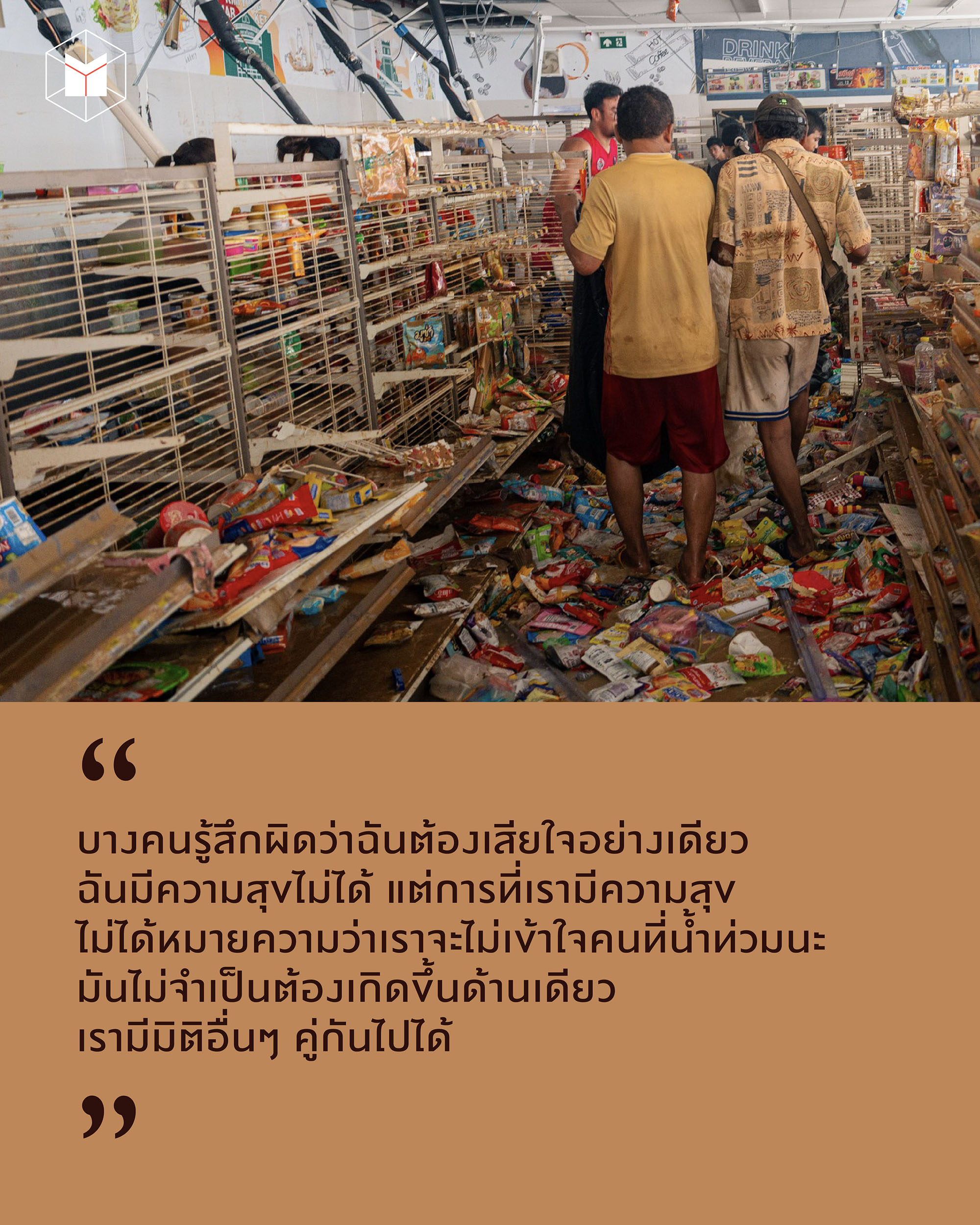 “เหมือนเวลาเกิดเหตุฉุกเฉินบนเครื่องบิน เราต้องสวมหน้ากากออกซิเจนให้ตัวเองก่อนใส่ให้คนอื่น ดังนั้นในระหว่างที่ติดตามข่าวสาร อย่าลืมว่าการกินหรือการนอนของเราก็สำคัญไม่แพ้กัน บางคนรู้สึกผิดว่าฉันต้องเสียใจอย่างเดียว ฉันมีความสุขไม่ได้ แต่การที่เรามีความสุขไม่ได้หมายความว่าเราจะไม่เข้าใจคนที่น้ำท่วมนะ มันไม่จำเป็นต้องเกิดขึ้นด้านเดียว เรามีมิติอื่นๆ คู่กันไปได้”