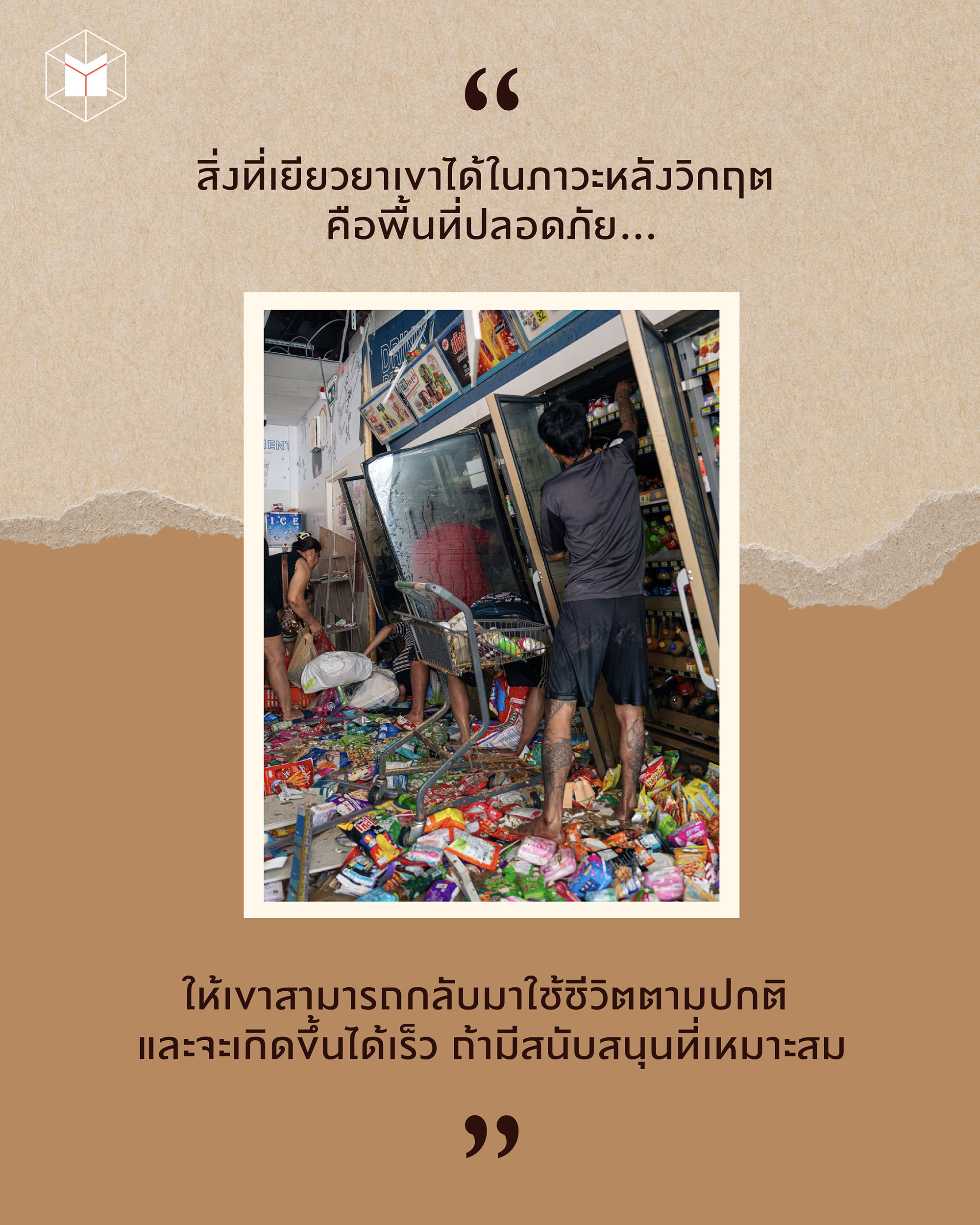 แม้แต่ละคนจะรับมือกับความสูญเสียไม่เหมือนกัน แต่ไม่ว่าใครต่างต้องการความปลอดภัยในชีวิต ดังนั้นการดูแลให้ทุกคนรู้สึกปลอดภัยทั้งกายและใจ จึงเป็นก้าวแรกของการเยียวยา เพื่อช่วยให้ผู้คนกลับไปใช้ชีวิตได้ตามปกติอีกครั้ง