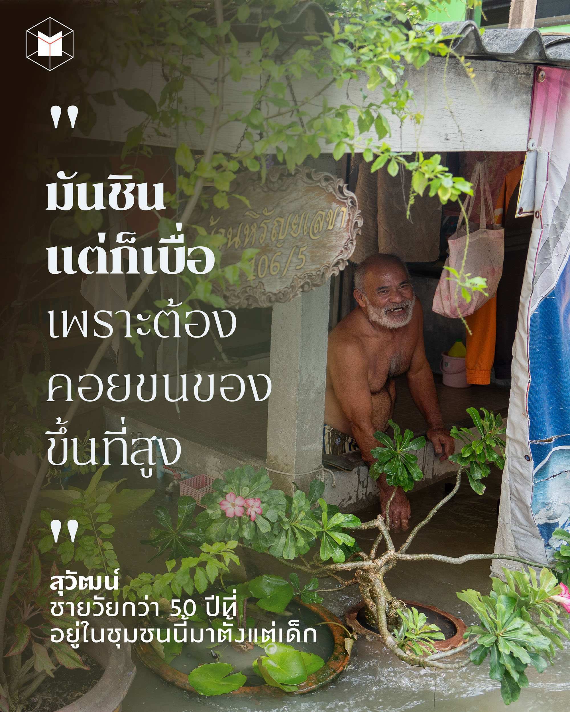 สุวัฒน์ ชายวัยกว่า 50 ปีที่อยู่ในชุมชนนี้มาตั้งแต่เด็ก เขาบอกว่าแม้น้ำจะท่วมทุกปี แต่ปีนี้กลับยาวนานและซ้ำซากกว่าปกติ “มันชิน แต่ก็เบื่อ” เขาบอกว่าเดินทางออกนอกชุมชนไม่ลำบากมาก แต่สิ่งที่ยากคือการดูแลบ้าน เพราะทุกครั้งที่น้ำขึ้นต้องรีบยกข้าวของขึ้นสูง ไม่อย่างนั้นจะเสียหายทั้งหมด