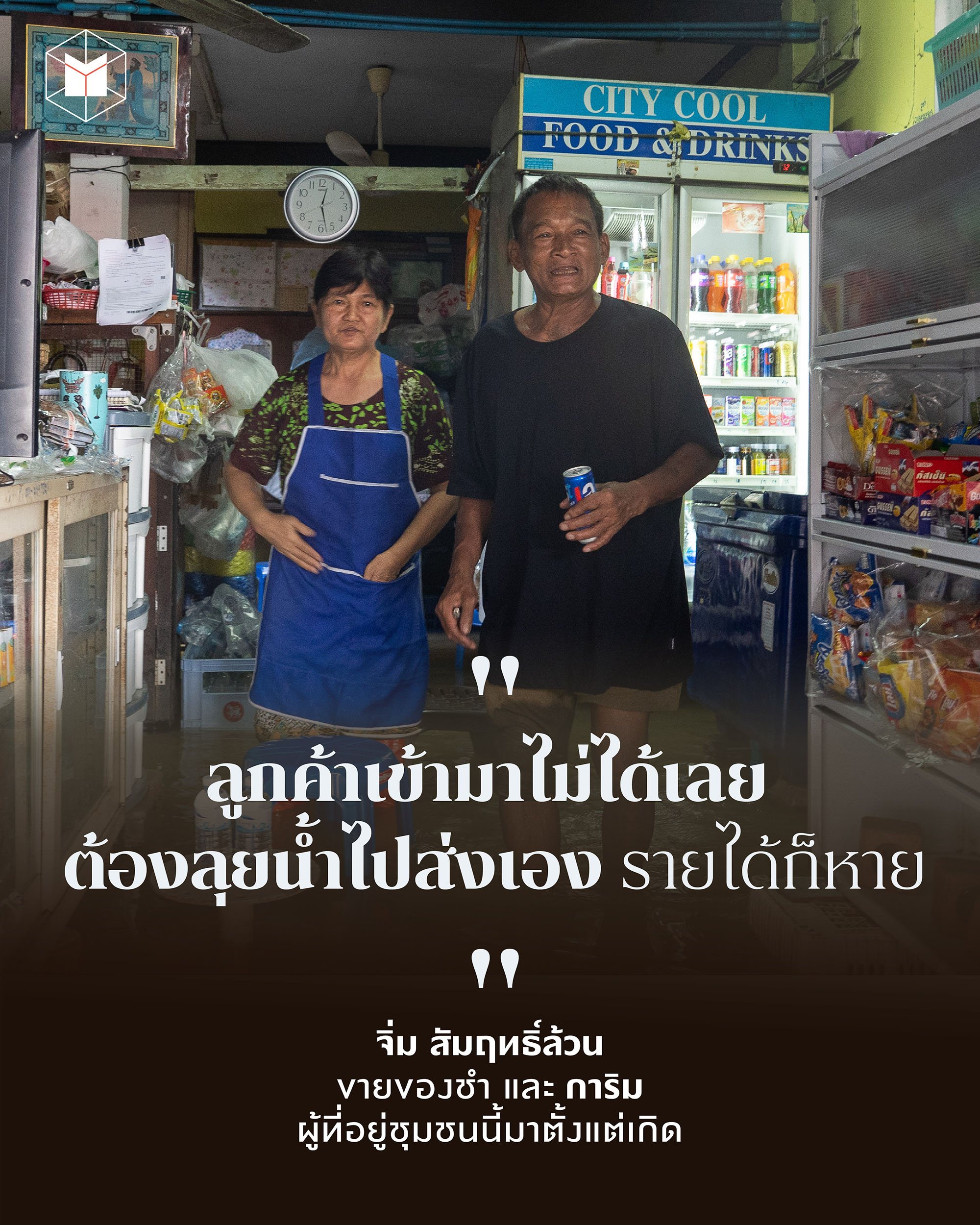 ร้านค้าขนาดเล็กในชุมชนก็ได้รับผลกระทบไม่ต่างกัน ฟ้า ซึ่งขายของชำในซอย เล่าว่าทุกวันต้องลุยน้ำลึกเพื่อไปส่งของให้ลูกค้า และหลายครั้งก็ล้มจนขาเป็นแผล เธอบอกอย่างตรงไปตรงมาว่า “ข้าวสาร อาหารแห้ง มันจำเป็นมากจริงๆ ปีนี้ไม่มีใครมาดูเลยค่ะ”