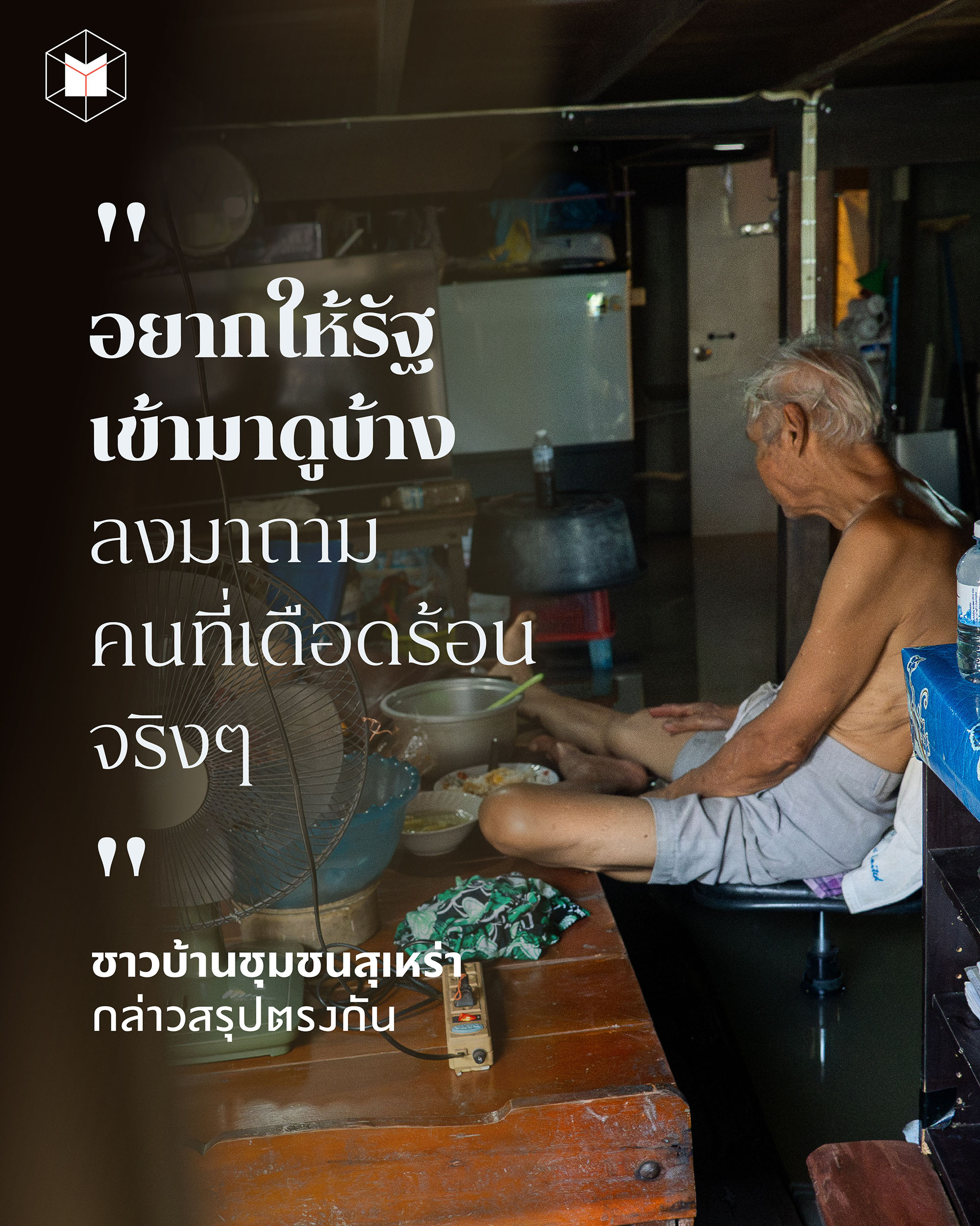 เสียงสะท้อนจากชุมชนชัดเจนเป็นหนึ่งเดียว คือ ปีนี้ไม่มีความช่วยเหลือจากภาครัฐเข้ามาเลย ทั้งที่ความเดือดร้อนมีมากกว่าเดิมหลายเท่า “เริ่มท่วมตั้งแต่กันยาแล้ว และมันก็อยู่แบบนี้มาตลอด” โดยไม่มีสัญญาณว่า น้ำจะลดลงในเร็วๆ นี้