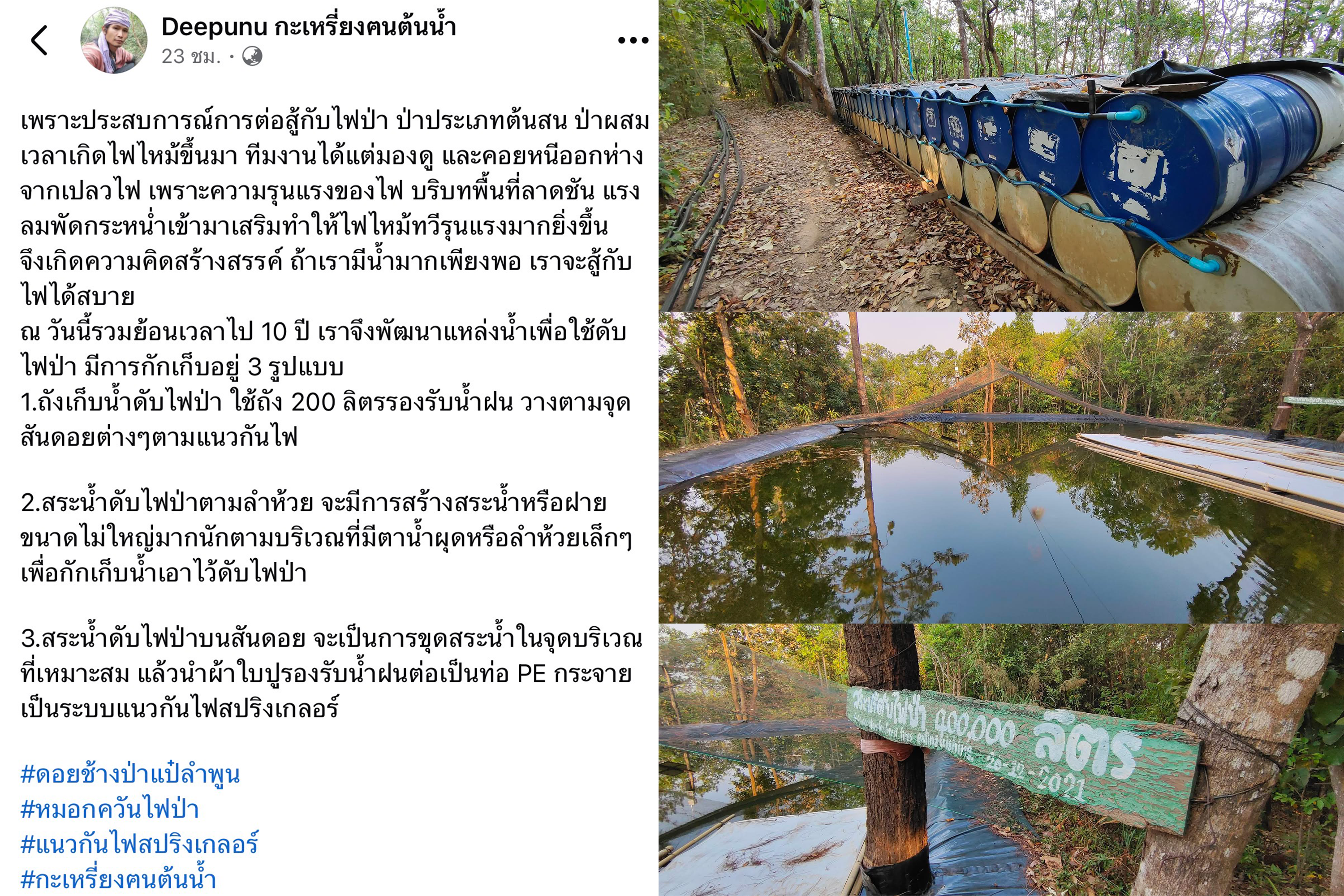 เช่นเดียวกับหมู่บ้านกะเหรี่ยงที่ดอยช้างป่าแป๋ จังหวัดลำพูน ที่มีการตั้งถังน้ําในเขตต้นน้ําและป่าต้นน้ําแล้วต่อกับสปริงเกอร์ แม้จะต้องใช้ต้นทุนจำนวนหนึ่ง แต่ก็สะท้อนว่าพวกเขาพยายามคิดค้นนวัตกรรมสำหรับการจัดการไฟ