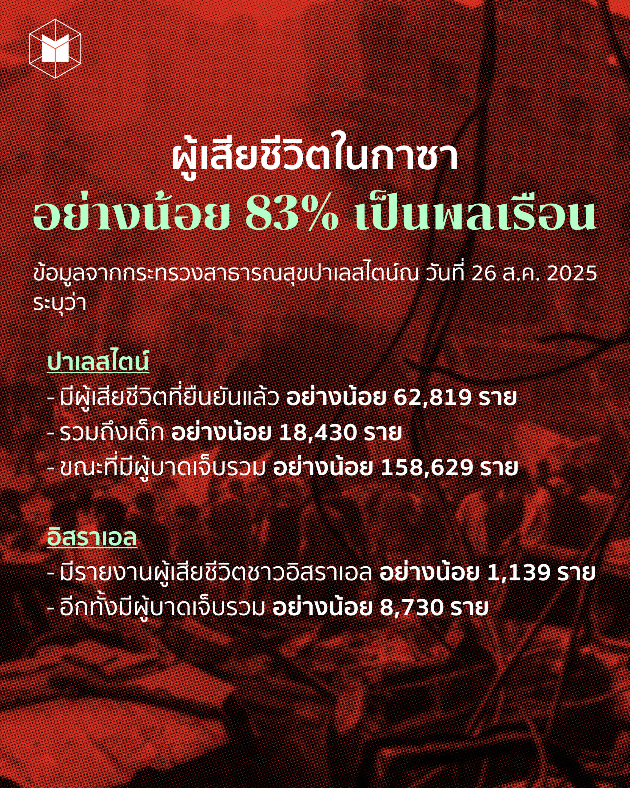 เดือนสิงหาคมที่ผ่านมา สำนักข่าว The Guardian, +972 Magazine และ Local Call รายงานการสืบสวนร่วมกันว่า ชาวปาเลสไตน์อย่างน้อย 83% ที่เสียชีวิตในการโจมตีของอิสราเอลในฉนวนกาซา “เป็นพลเรือน”