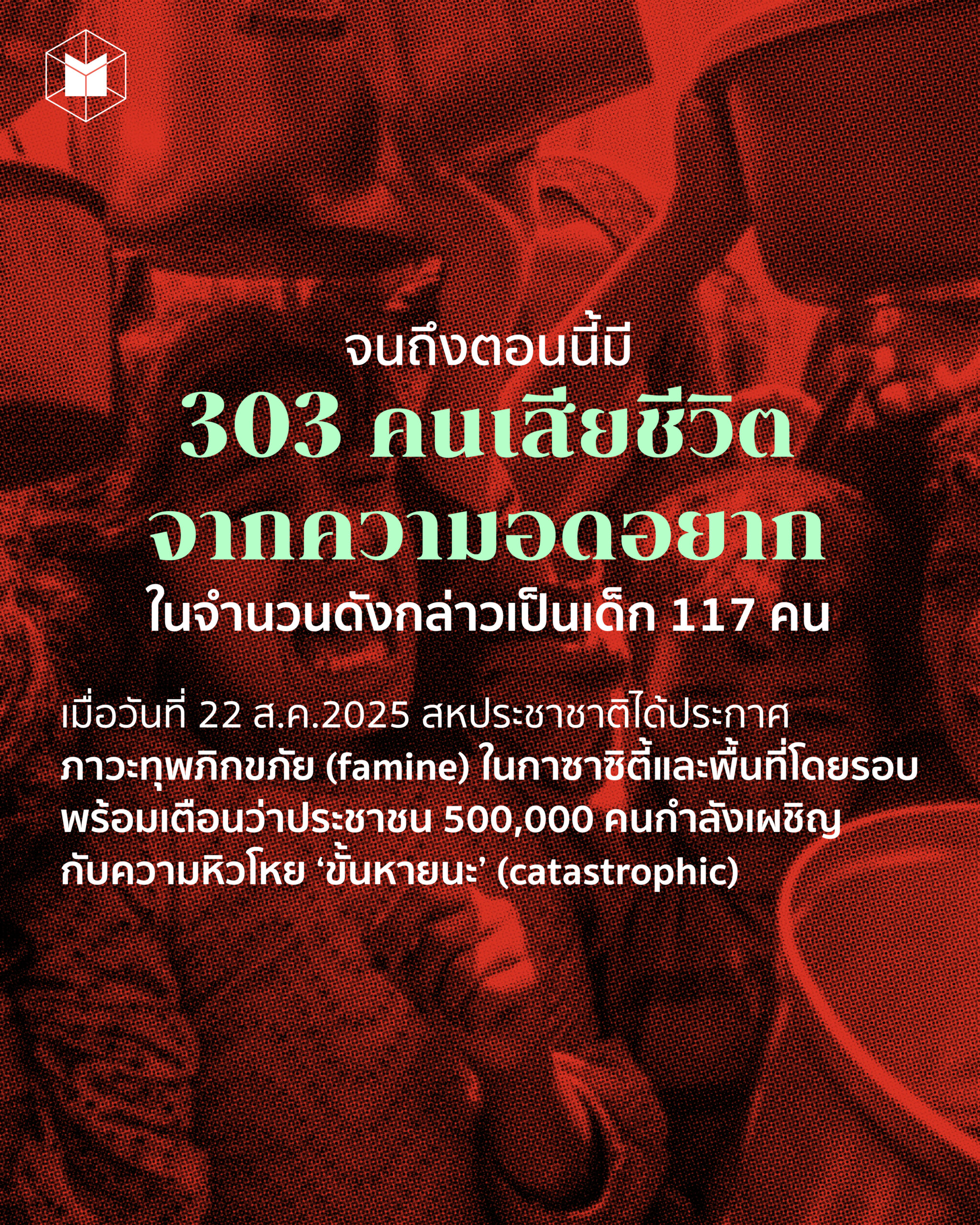 วันที่ 22 สิงหาคม 2025 สหประชาชาติได้ประกาศภาวะทุพภิกขภัย (Famine) ในกาซาซิตี้ (Gaza City) และพื้นที่โดยรอบ พร้อมเตือนว่าประชาชนกว่า 500,000 คนกำลังเผชิญกับความหิวโหย ‘ขั้นหายนะ’ (Catastrophic)