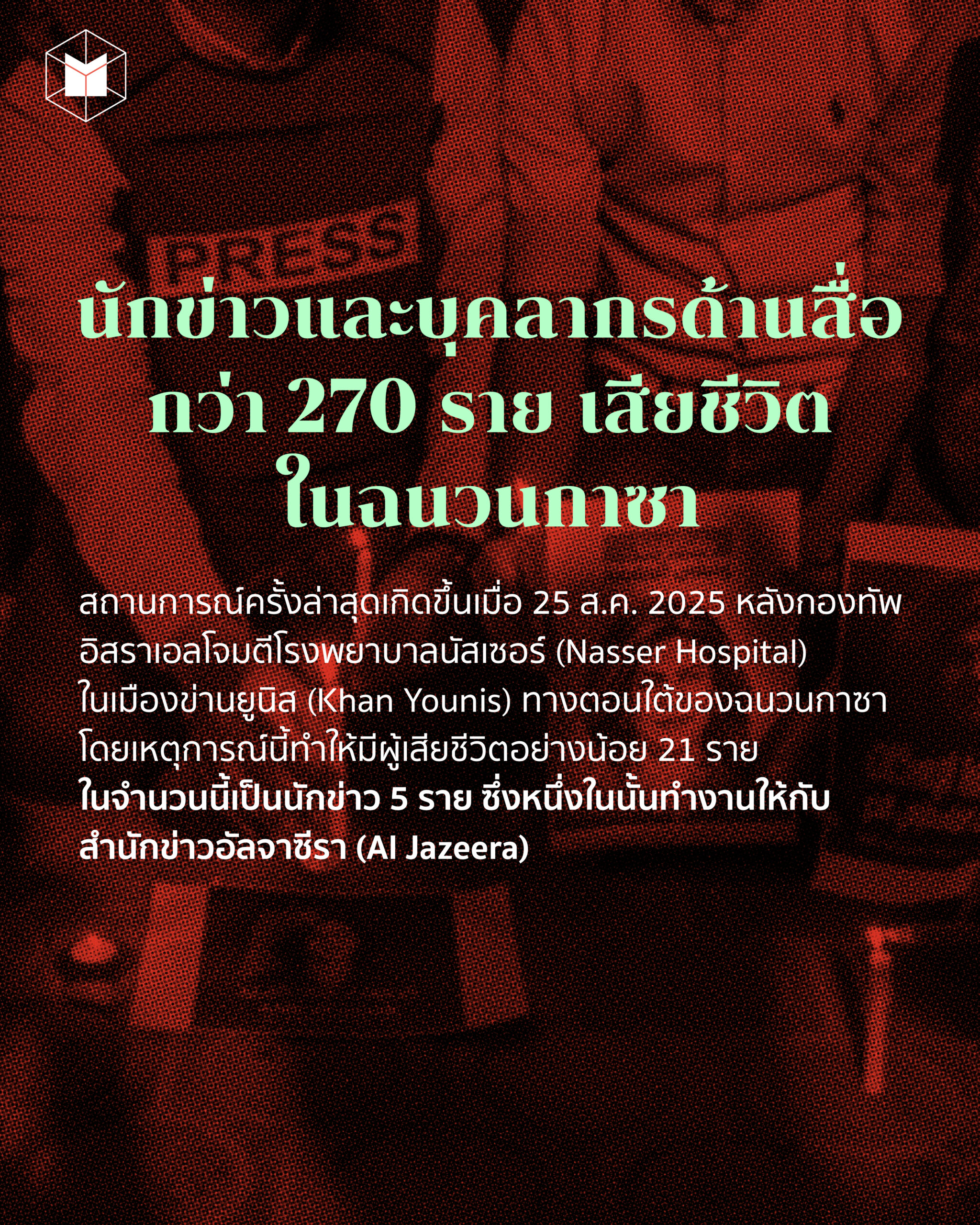 หากนับยอดผู้เสียชีวิตในแวดวงสื่อ Al Jazeer รายงานว่า นับตั้งแต่สงครามเริ่มต้นขึ้นในเดือนตุลาคม 2023 อิสราเอลได้สังหารนักข่าวและบุคลากรด้านสื่อในฉนวนกาซาไปแล้วกว่า 270 ราย พร้อมชี้ว่า สงครามที่ดำเนินมาตลอดระยะเวลาเกือบ 2 ปี ไม่เพียงแต่ส่งผลกระทบด้านการงานของกลุ่มนักข่าวภาคสนามเท่านั้น แต่ยังส่งผลกระทบต่อชีวิตส่วนตัวของพวกเขาอีกด้วย จนกลายเป็นความกังวลว่า สื่อในฉนวนกาซาจะกำลังลดลงเรื่อยๆ