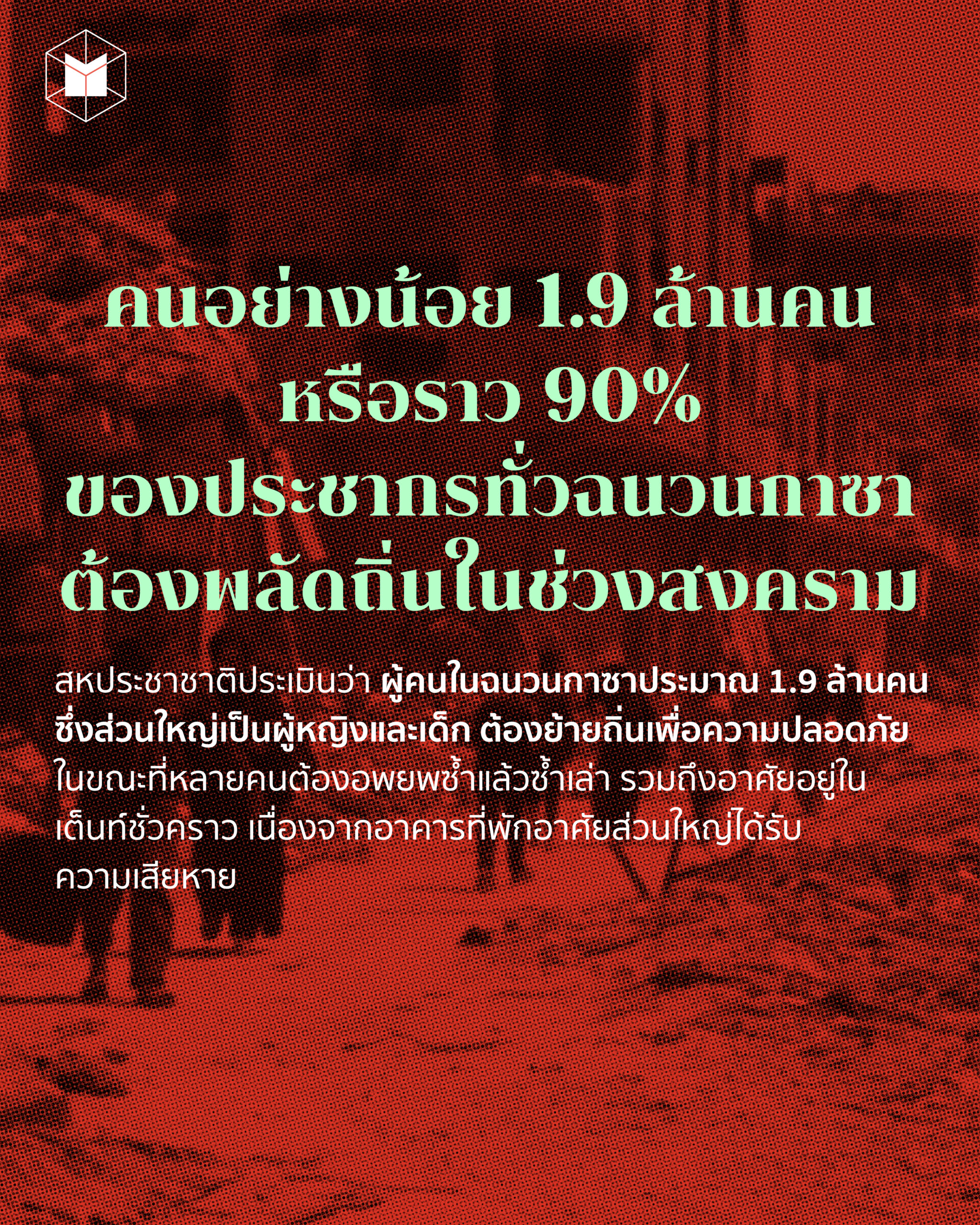 คนอย่างน้อย 1.9 ล้านคน หรือราว 90% ของประชากรทั่วฉนวนกาซา ต้องพลัดถิ่นในช่วงสงคราม