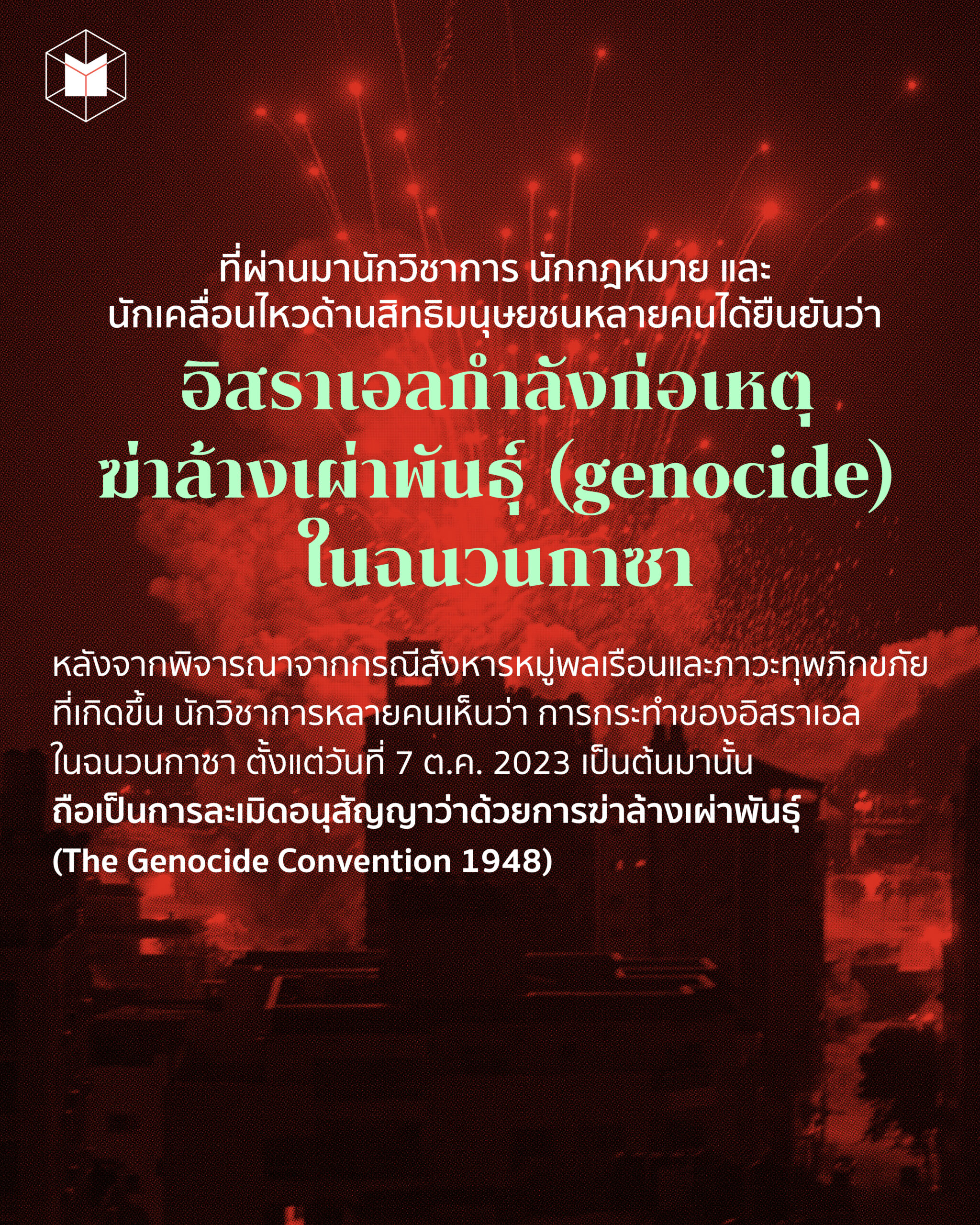ที่ผ่านมานักวิชาการ นักกฎหมาย และนักเคลื่อนไหวด้านสิทธิมนุษยชนหลายคนได้ยืนยันว่า อิสราเอลกำลังก่อเหตุ ‘ฆ่าล้างเผ่าพันธุ์’ (genocide) ในฉนวนกาซา