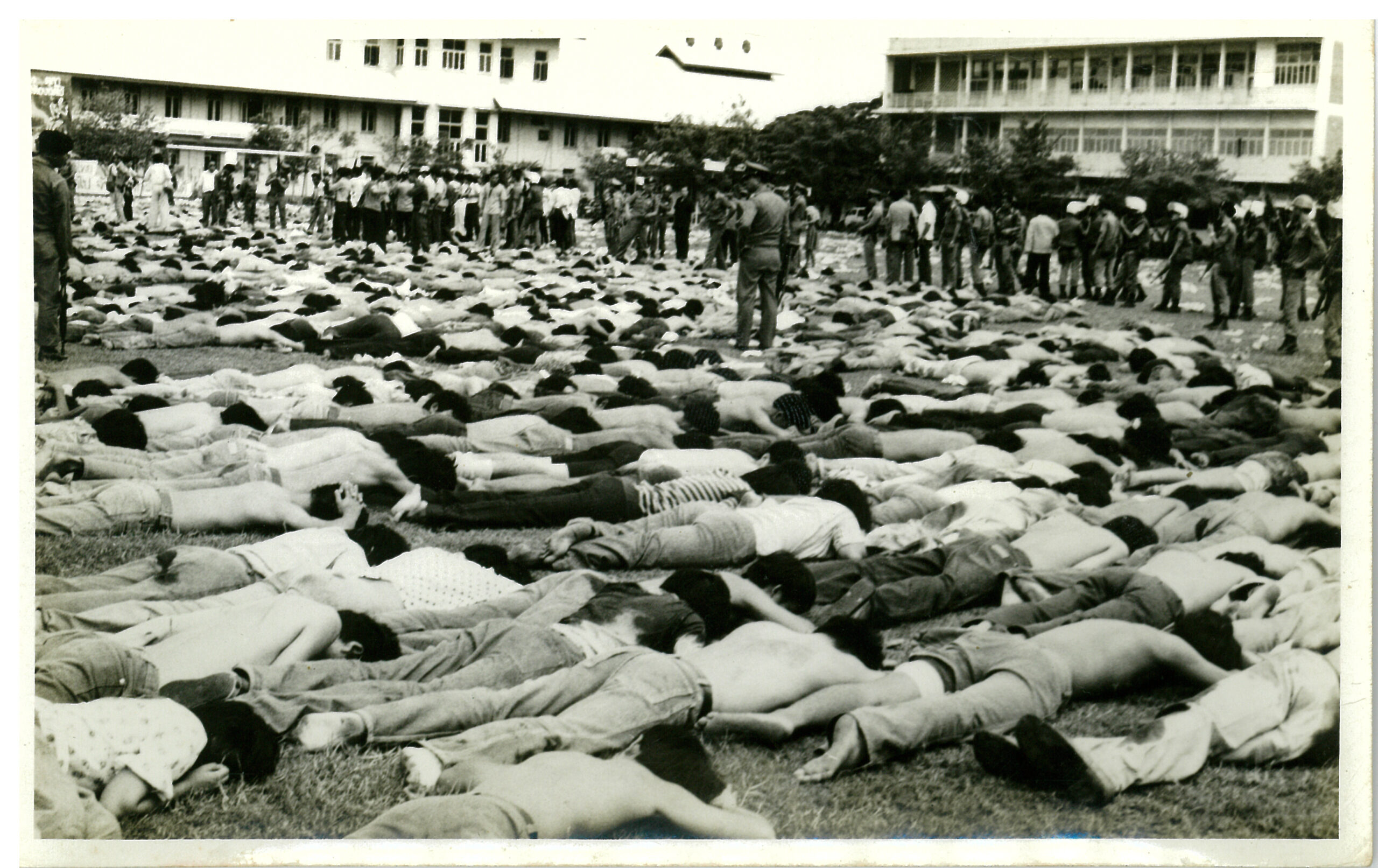ภาพ การจับกุมผู้เข้าร่วมการชุมนุม 6 ตุลา 2519 บริเวณสนามฟุตบอล มหาวิทยาลัยธรรมศาสตร์