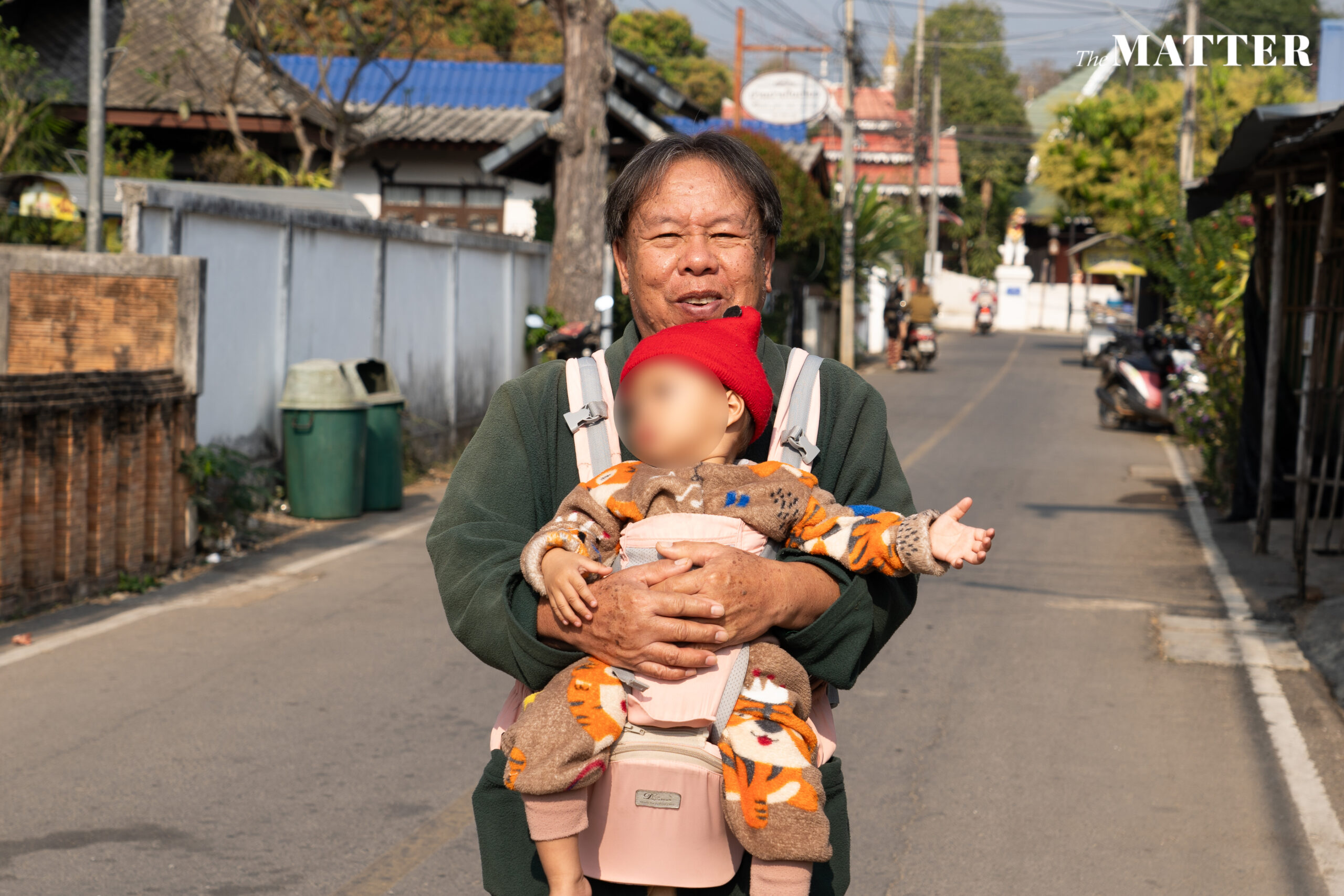 เสียงจาก ‘ลุงผ่อน’ ชายวัย 70 หน้าตาใจดีที่กำลังอุ้มหลานชายตัวเล็กที่อายุไม่เกิน 2 ขวบ เดินเล่นอยู่หน้าบ้าน