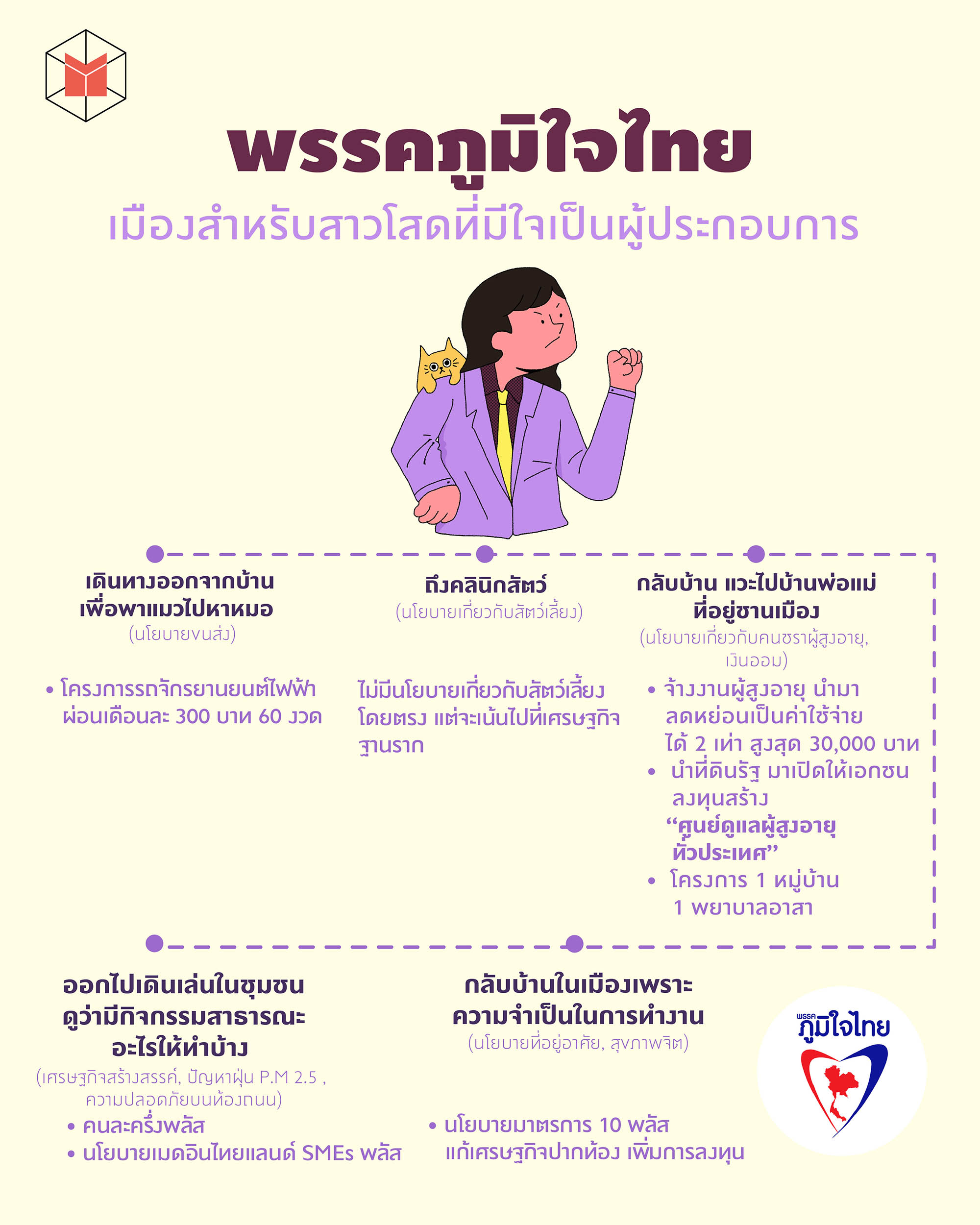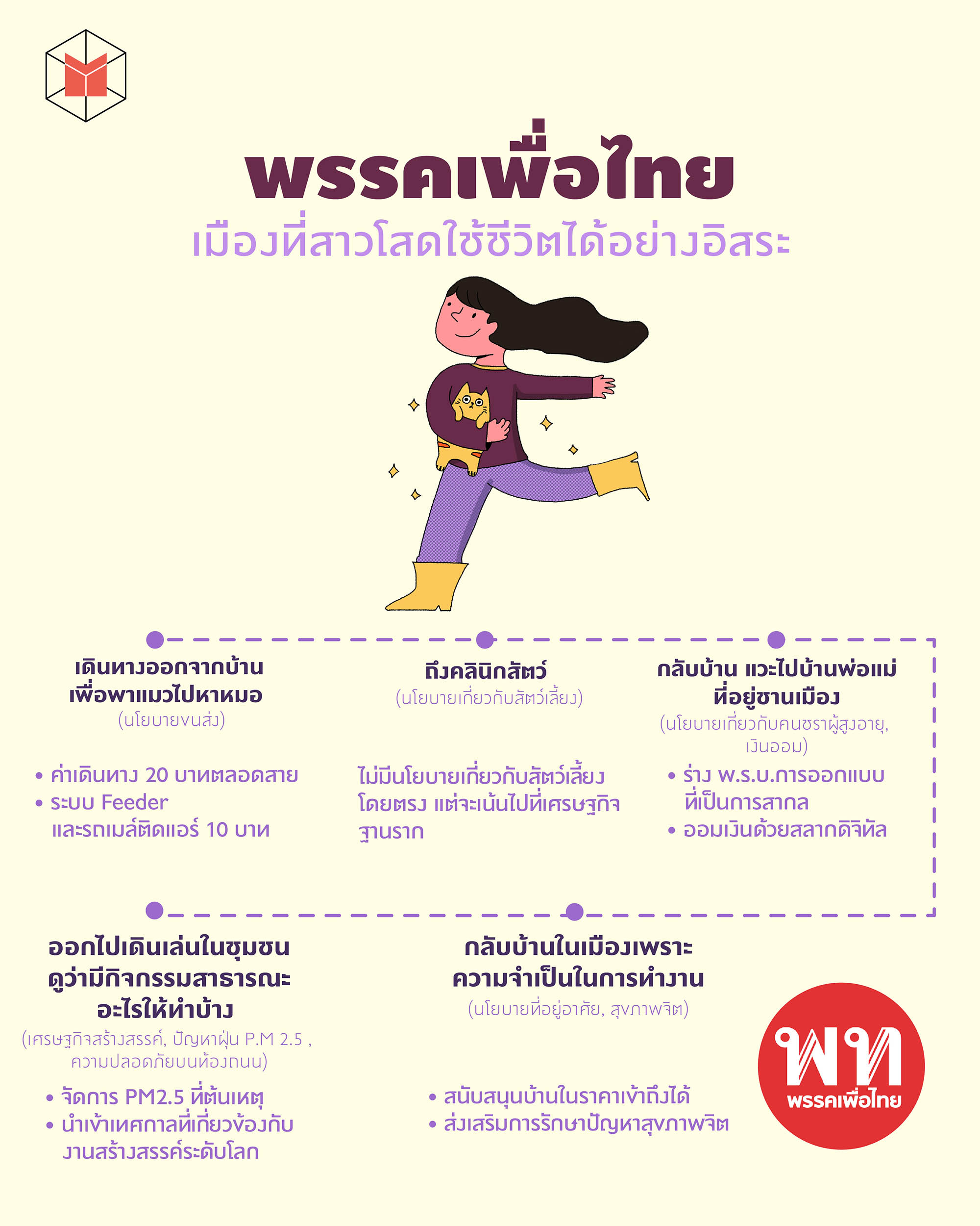 วันนี้เราเลยอยากชวนมาดูกันว่า ถ้าหากนโยบายของแต่ละพรรคถ้าทำได้จริง หน้าตาคุณภาพชีวิตของเราจะเป็นยังไงบ้าง โดยเราขอยกตัวอย่างชีวิตในวันหยุดพักผ่อนของ ‘น้องแมท’ สาวโสดที่ใช้ชีวิตในเมืองกับ ‘เจ้าเหมียว’ สัตว์เลี้ยงของตัวเอง ซึ่งในวันนี้มีภารกิจต้องพาเจ้าเหมียวไปคลินิกรักษาสัตว์ แวะไปเยี่ยมพ่อแม่ที่ชานเมือง เดินเล่นแถวบ้าน ก่อนกลับมาที่คอนโดของตัวเอง เพื่อทำงานในเมืองหลวงวันถัดไป