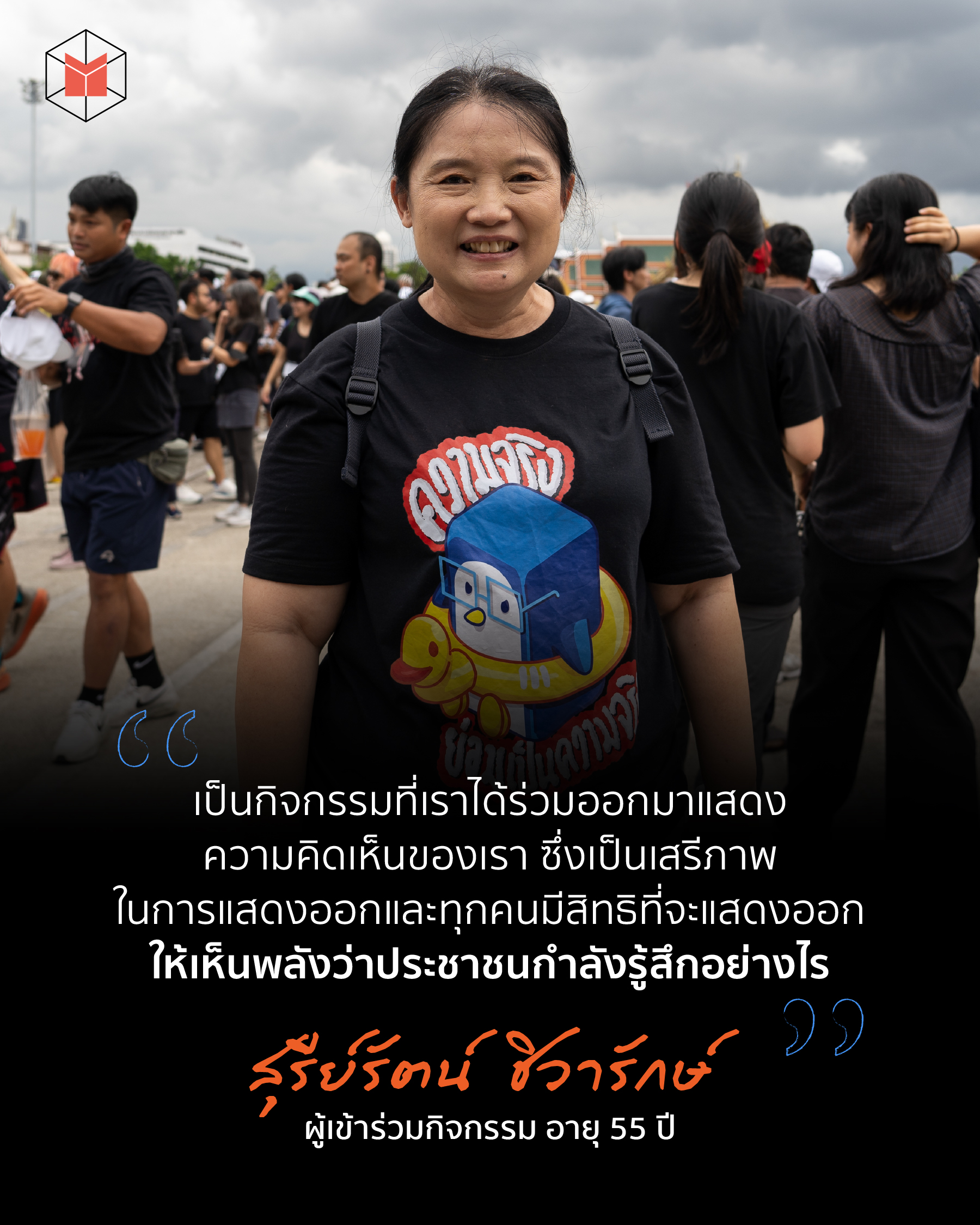 “เป็นกิจกรรมที่เราได้ร่วมออกมาแสดงความคิดเห็นของเรา ซึ่งเป็นเสรีภาพในการแสดงออกและทุกคนมีสิทธิที่จะแสดงออก ให้เห็นพลังว่าประชาชนกำลังรู้สึกอย่างไร”