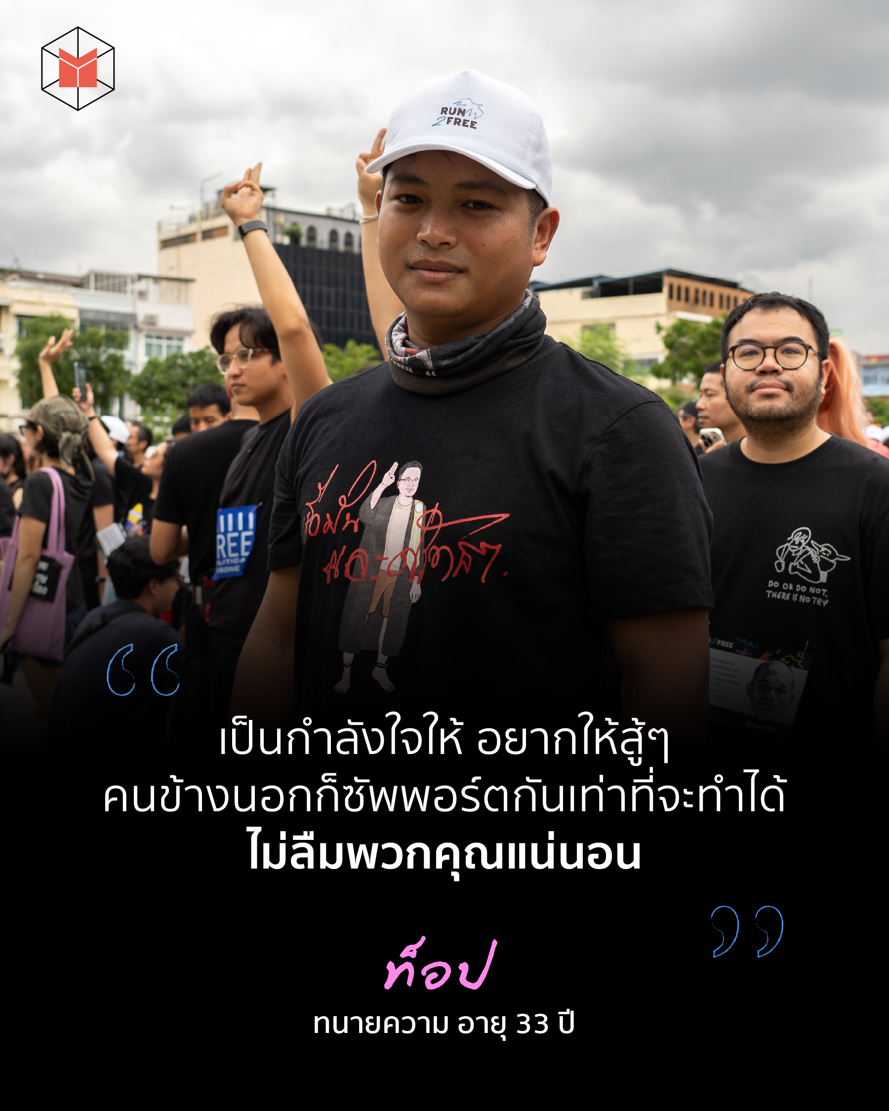 สุดท้ายนี้ ท็อปอยากฝากข้อความของผู้ถูกคุมขังทางการเมืองว่า “เป็นกำลังใจให้ อยากให้สู้ๆ คนข้างนอกก็ซัปพอร์ตกันเท่าที่จะทำได้ ไม่ลืมพวกคุณแน่นอน”