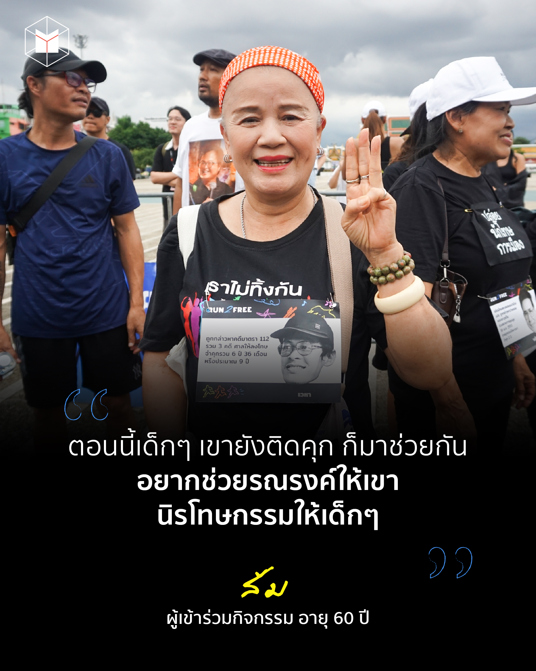 วันเสาร์ที่ผ่านมา (27 กันยายน 2568) iLaw, ThumbRights, และมูลนิธิอาสาสมัครเพื่อสังคม (มอส.) ร่วมกันจัดกิจกรรม ‘Run2Free | วิ่งเพื่อเสรีภาพ’ โดยเชิญประชาชนใส่เสื้อสีดำกับรองเท้าผ้าใบออกมาวิ่งจาก ลานคนเมือง ศาลาว่าการกรุงเทพมหานคร ถึง มหาวิทยาลัยธรรมศาสตร์ ท่าพระจันทร์