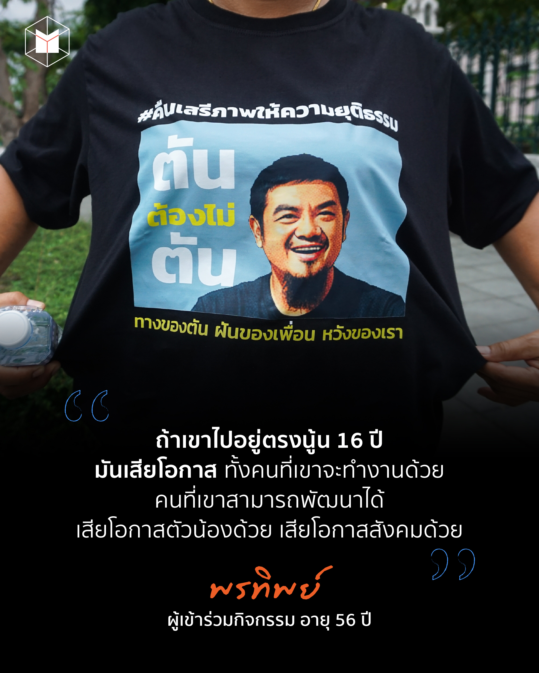 “ถ้าเขาไปอยู่ตรงนู้น 16 ปี มันเสียโอกาส ทั้งคนที่เขาจะทำงานด้วย คนที่เขาสามารถพัฒนาได้ เสียโอกาสตัวน้องด้วย เสียโอกาสสังคมด้วย เลยคิดว่าอยากจะมาร่วมเดินในวันนี้ อยากให้เขามีโอกาสได้ออกมาทำงานเพื่อสังคมต่อ” พรทิพย์ กล่าว