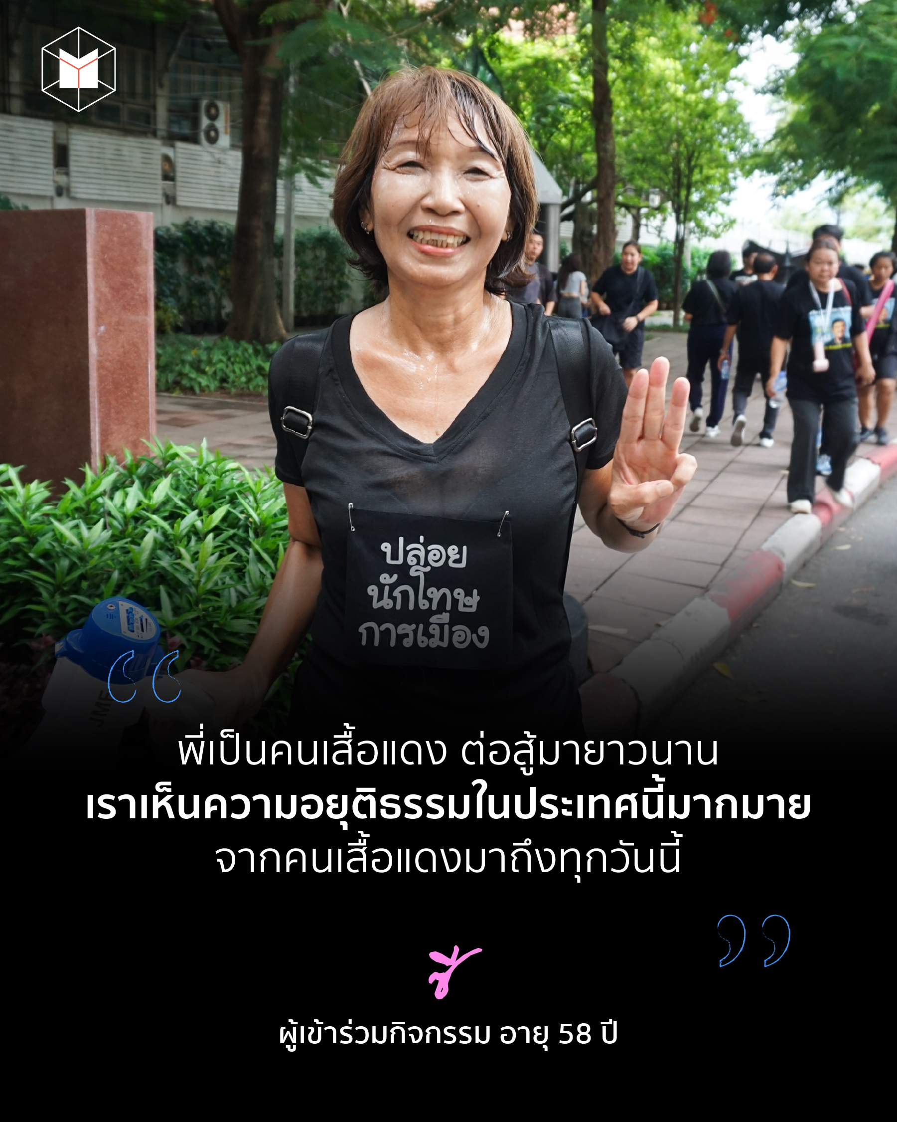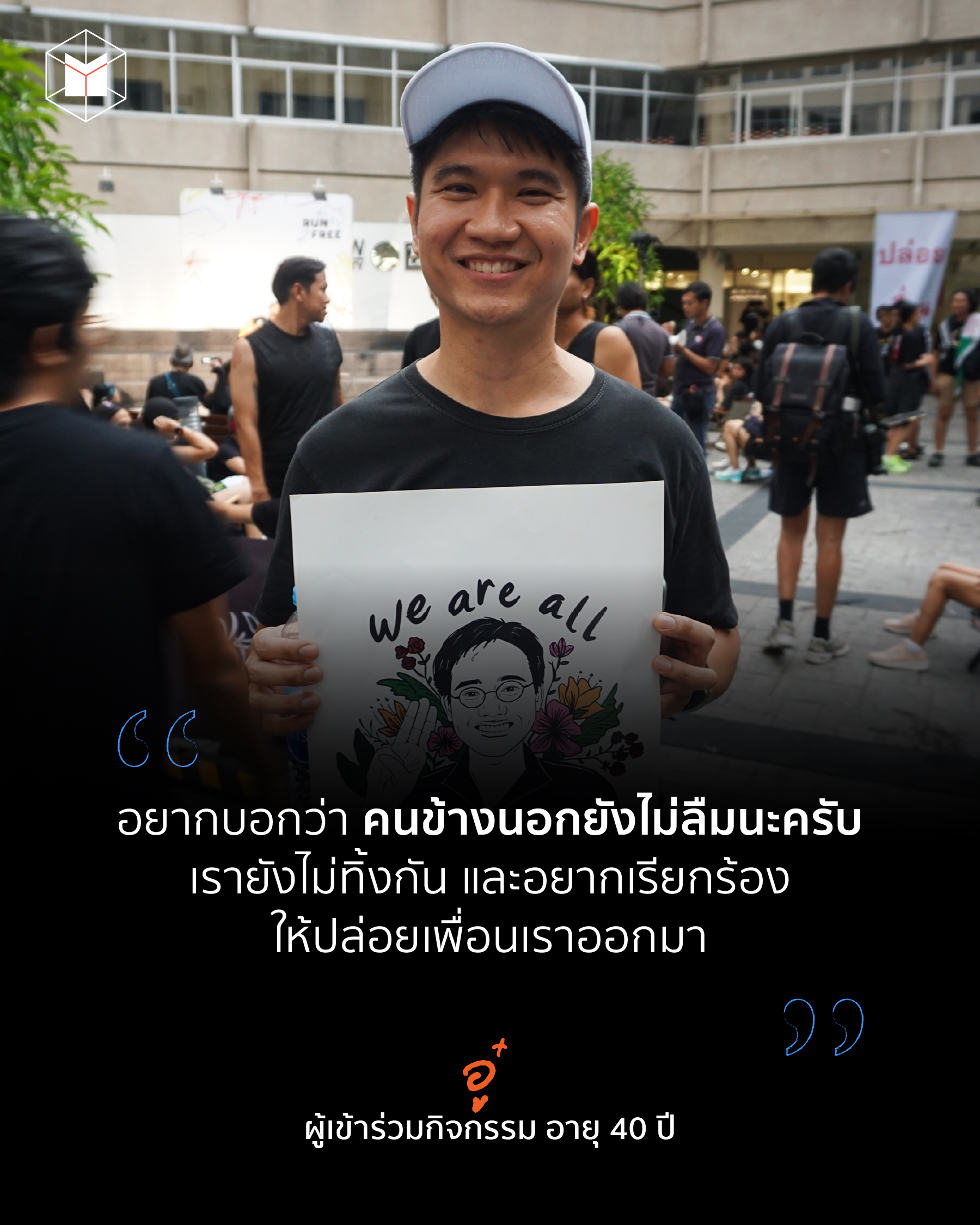 The MATTER ได้เข้าไปพูดคุยกับผู้ร่วมกิจกรรม ซึ่งมีทั้งบุคคลใกล้ชิดกับผู้ถูกคุมขังคดีทางการเมือง ผู้ไม่มีความเกี่ยวข้องใดแต่ออกมาร่วมกิจกรรม และผู้มีส่วนร่วมในการจัดกิจกรรม ว่าทำไมพวกเขาจึงออกมาเข้าร่วมกิจกรรมครั้งนี้