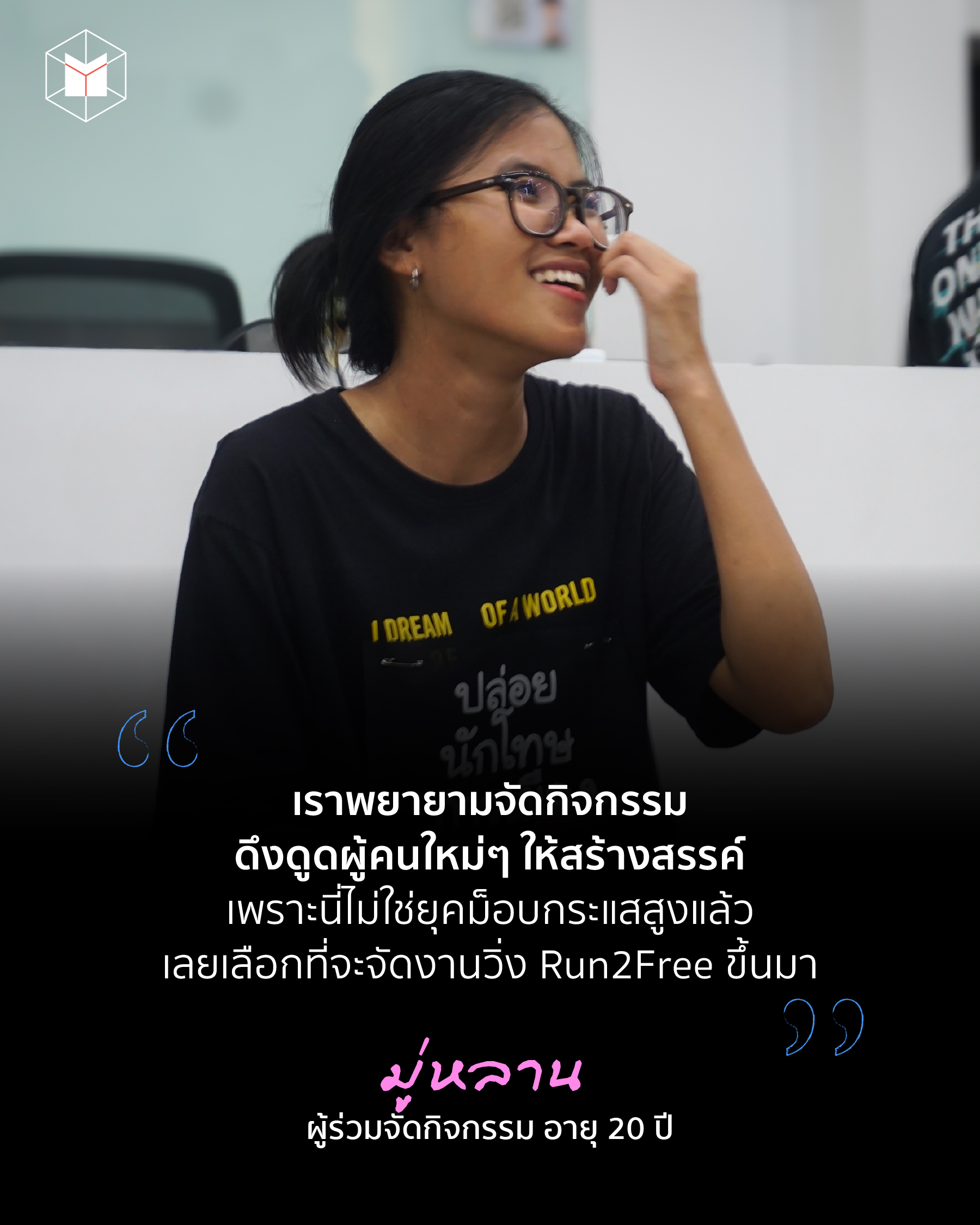 “เราพยายามจัดกิจกรรมดึงดูดผู้คนใหม่ๆ ให้สร้างสรรค์ เพราะนี่ไม่ใช่ยุคม็อบกระแสสูงแล้ว เลยเลือกที่จะจัดงานวิ่ง Run2Free ขึ้นมา” มู่หลาน กล่าว