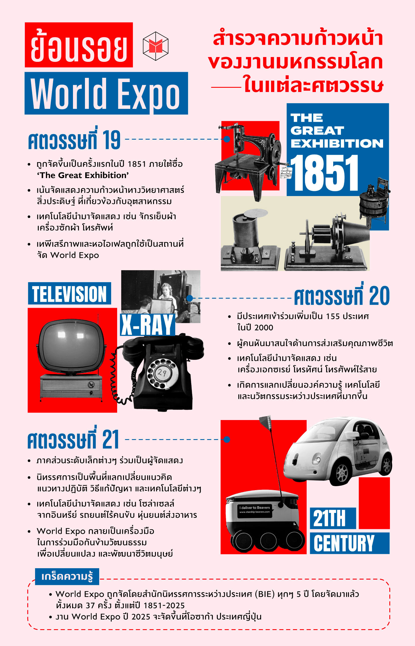 The MATTER จึงชวนทุกคนไปย้อนรอยสำรวจความก้าวหน้าของ World Expo กันว่าในแต่ละช่วงศตวรรษที่ผ่านมา ผู้คนให้ความสนใจกับเรื่องอะไรกันบ้าง