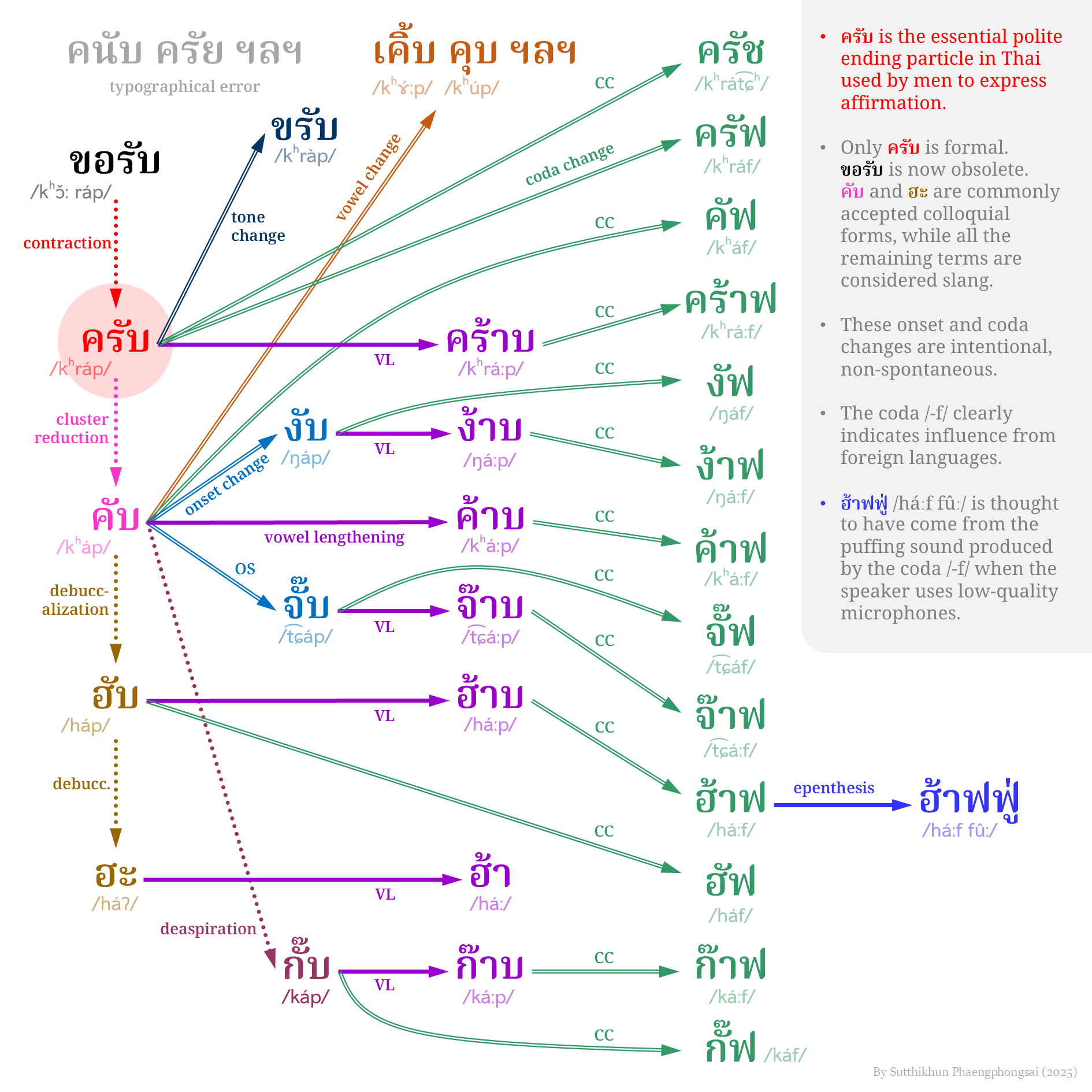 จากความสงสัยนั้น เขาเริ่มรวบรวมคำที่แตกแขนงจาก ‘ครับ’ และนำมาสร้างเป็นแผนภาพเชิงภาพ (visual diagram) ที่เชื่อมโยงคำเหล่านั้นเข้าด้วยกันอย่างเป็นระบบ